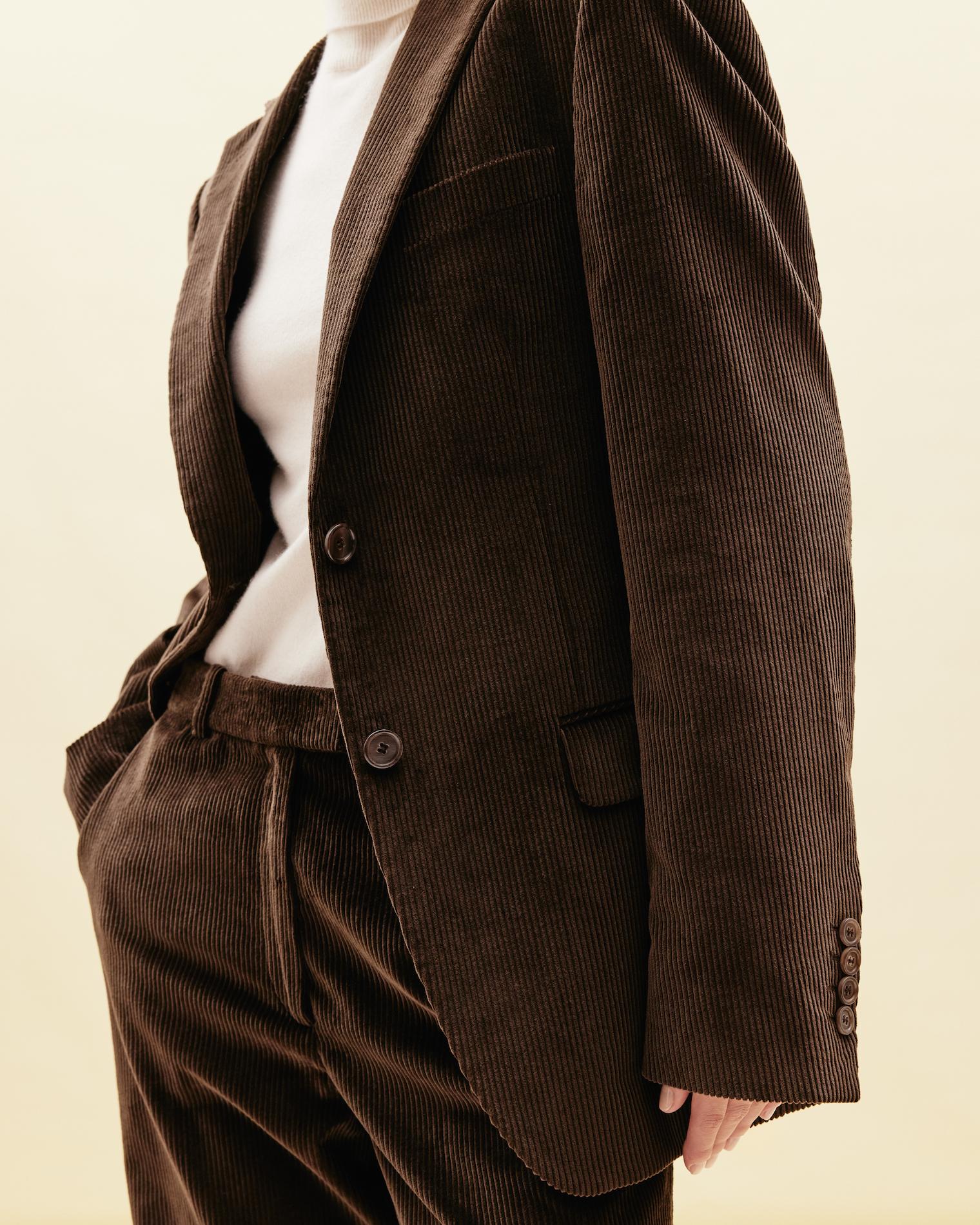 Однобортный пиджак из вельвета. Отложной воротник, карманы с клапанами, застежка на две пуговицы.