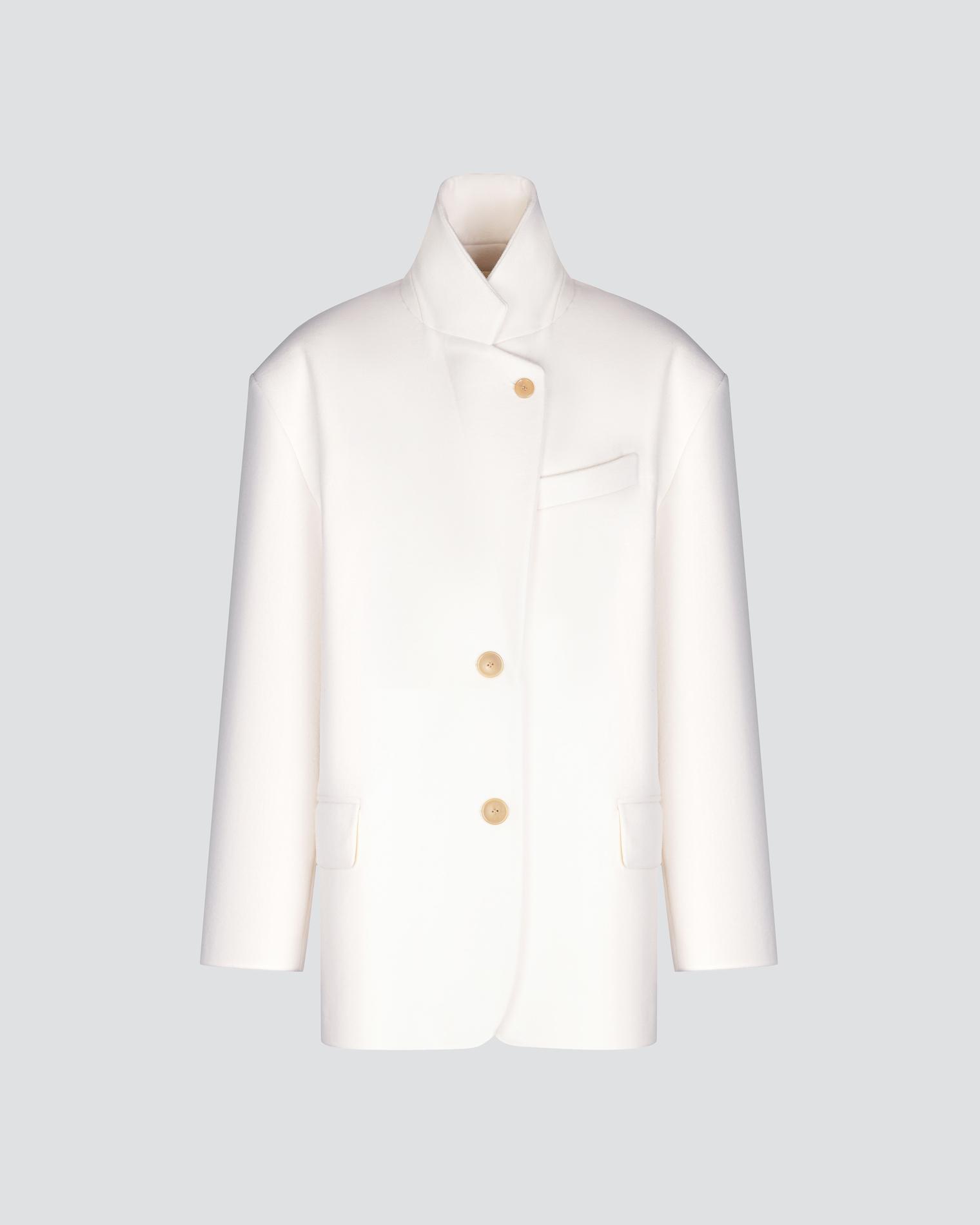 Однобортное пальто-пиджак из шерсти. Свободный силуэт, застежка на две пуговицы спереди и дополнительная пуговица на лацкане. Отложной воротник, прорезные карманы.