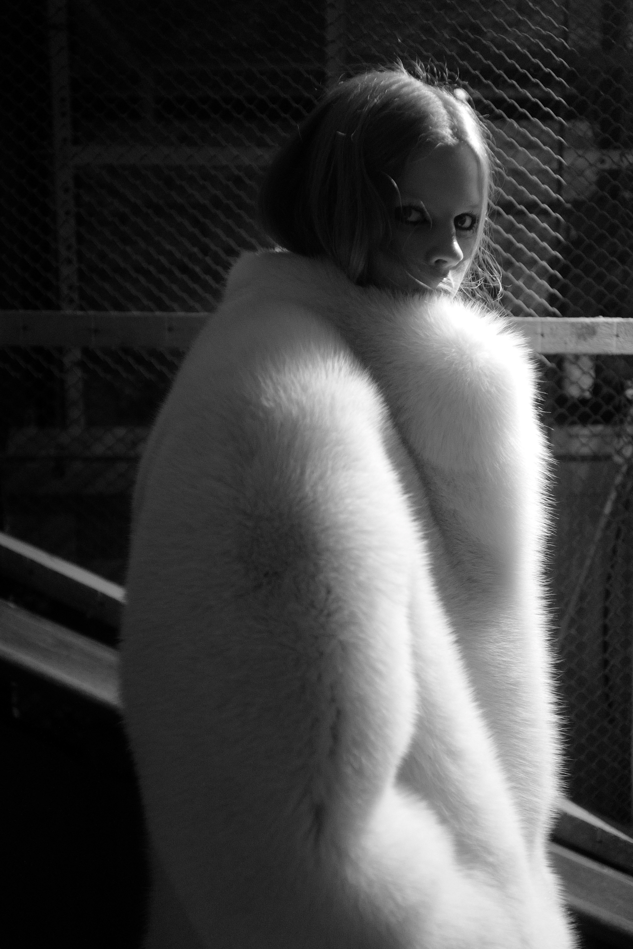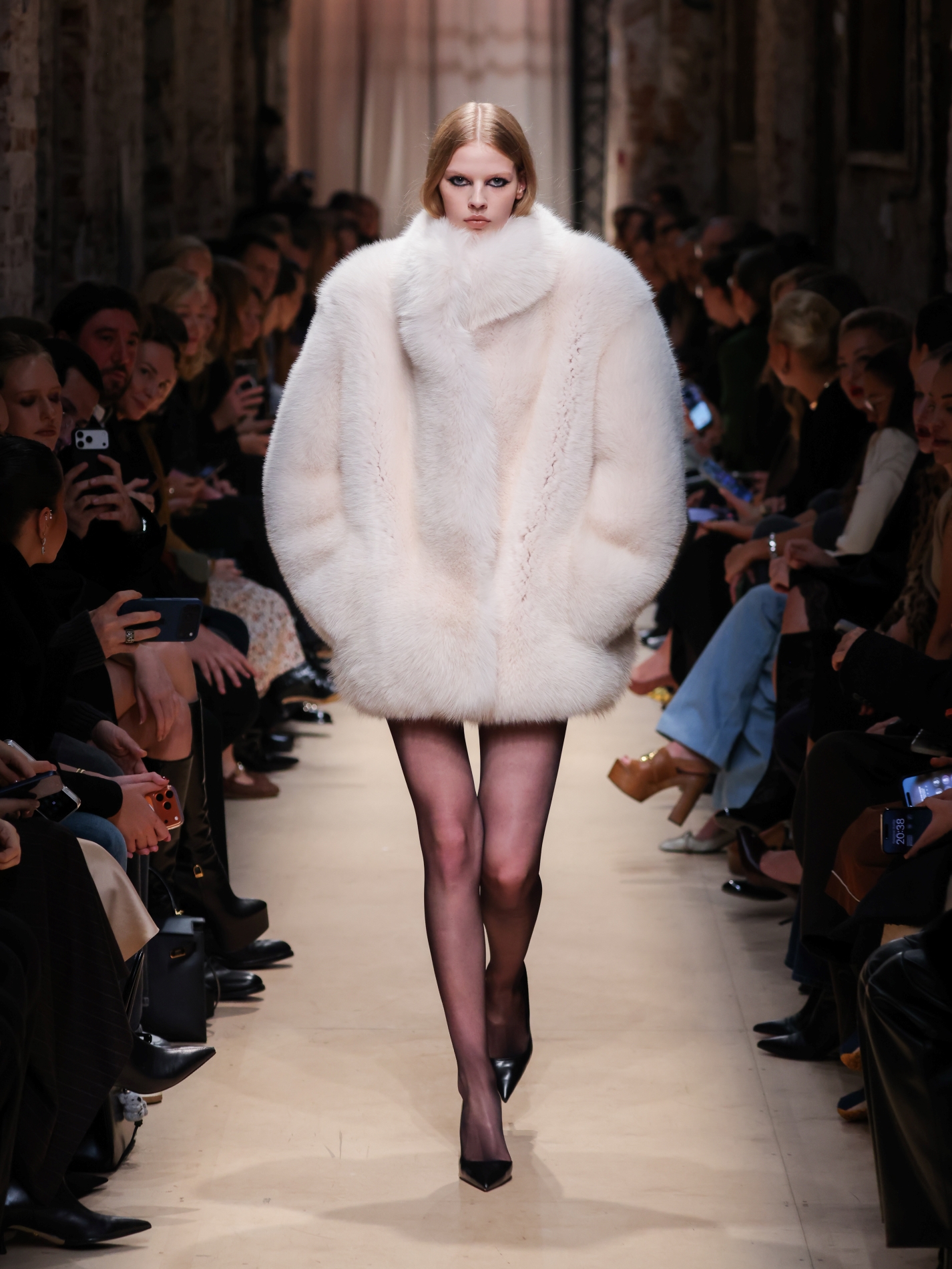 Шуба из меха арктической лисы. Подкладка в тон, прямой силуэт с воротником-стойкой.