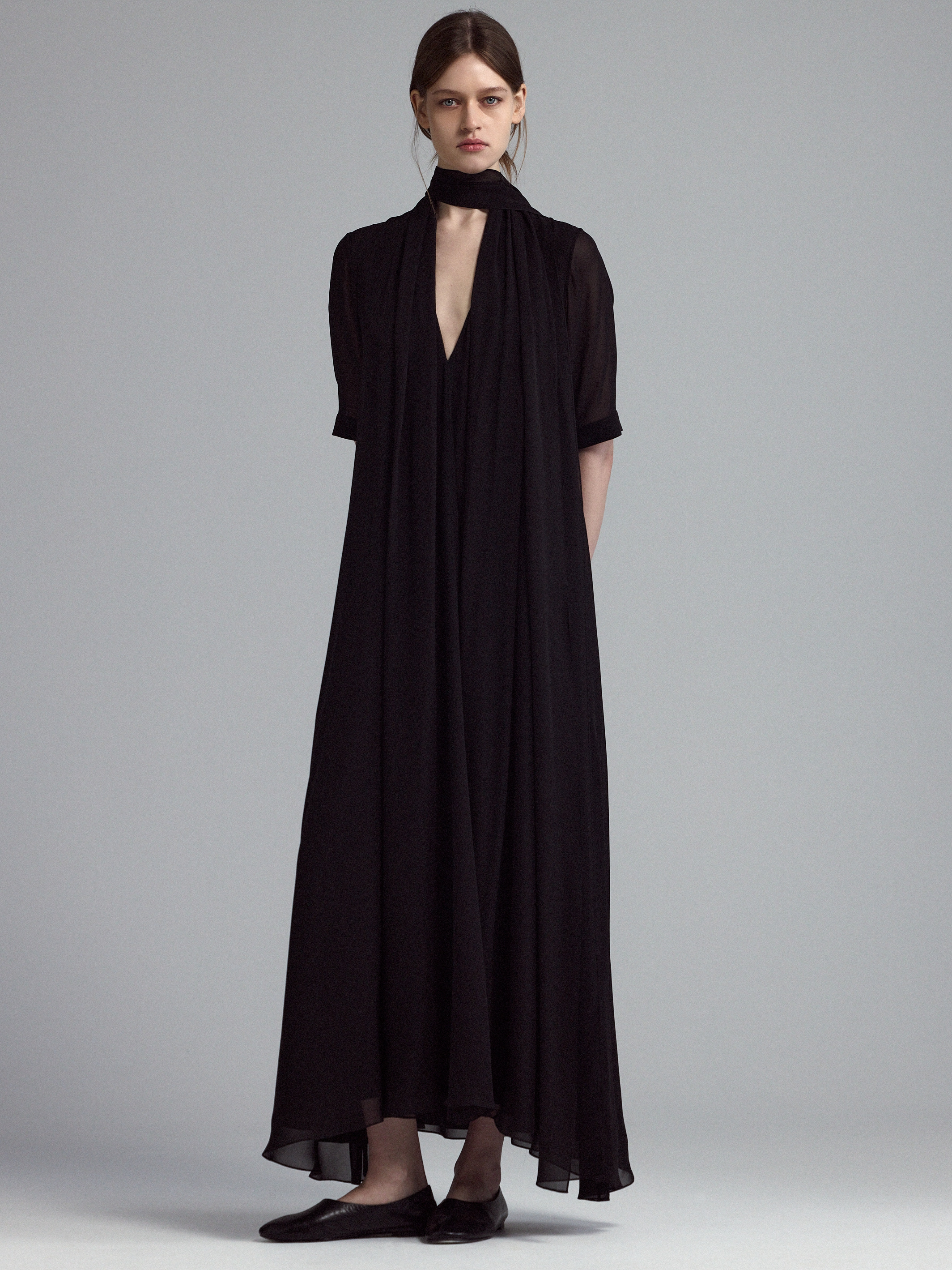 Платье из струящегося шелка. Полупрозрачные рукава, V-образный вырез, длина макси. Свободный силуэт с длинным поясом, если хочется сделать акцент на талии.