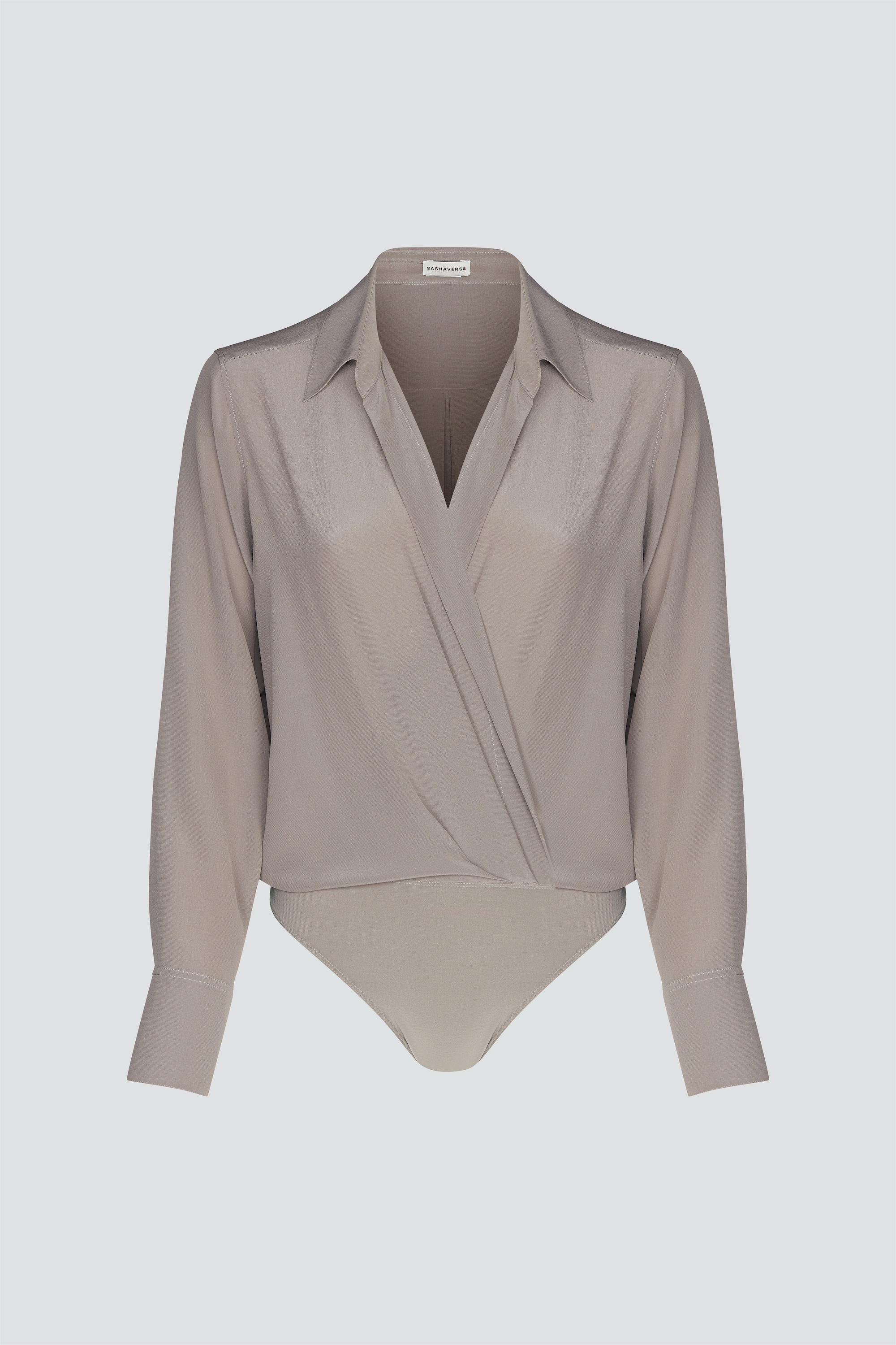 Боди с запахом из шелка. Длинные рукава, V-образный вырез, отложной воротник.