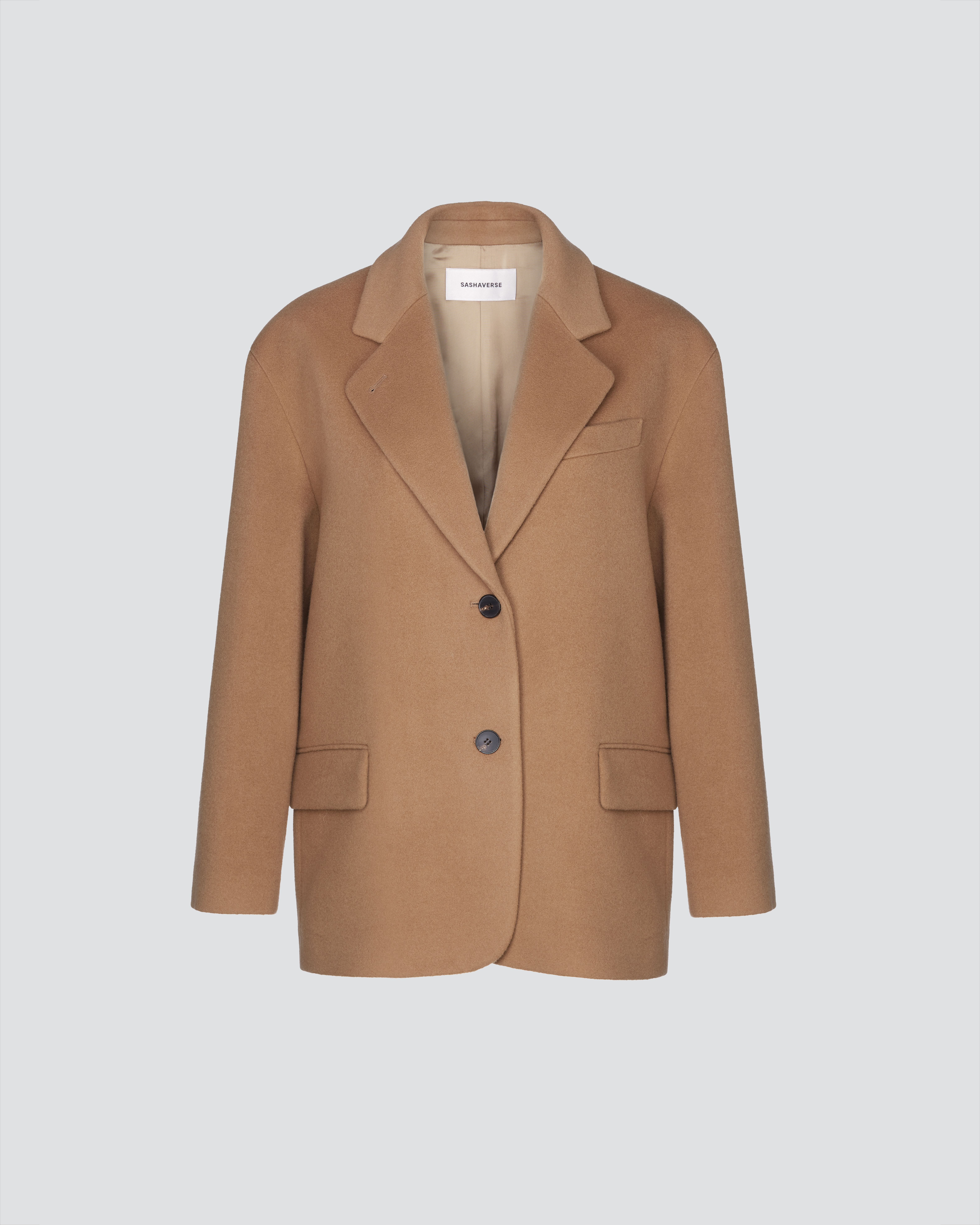 Однобортное пальто-пиджак из шерсти. Свободный силуэт, застежка на две пуговицы спереди и дополнительная пуговица на лацкане. Отложной воротник, прорезные карманы.