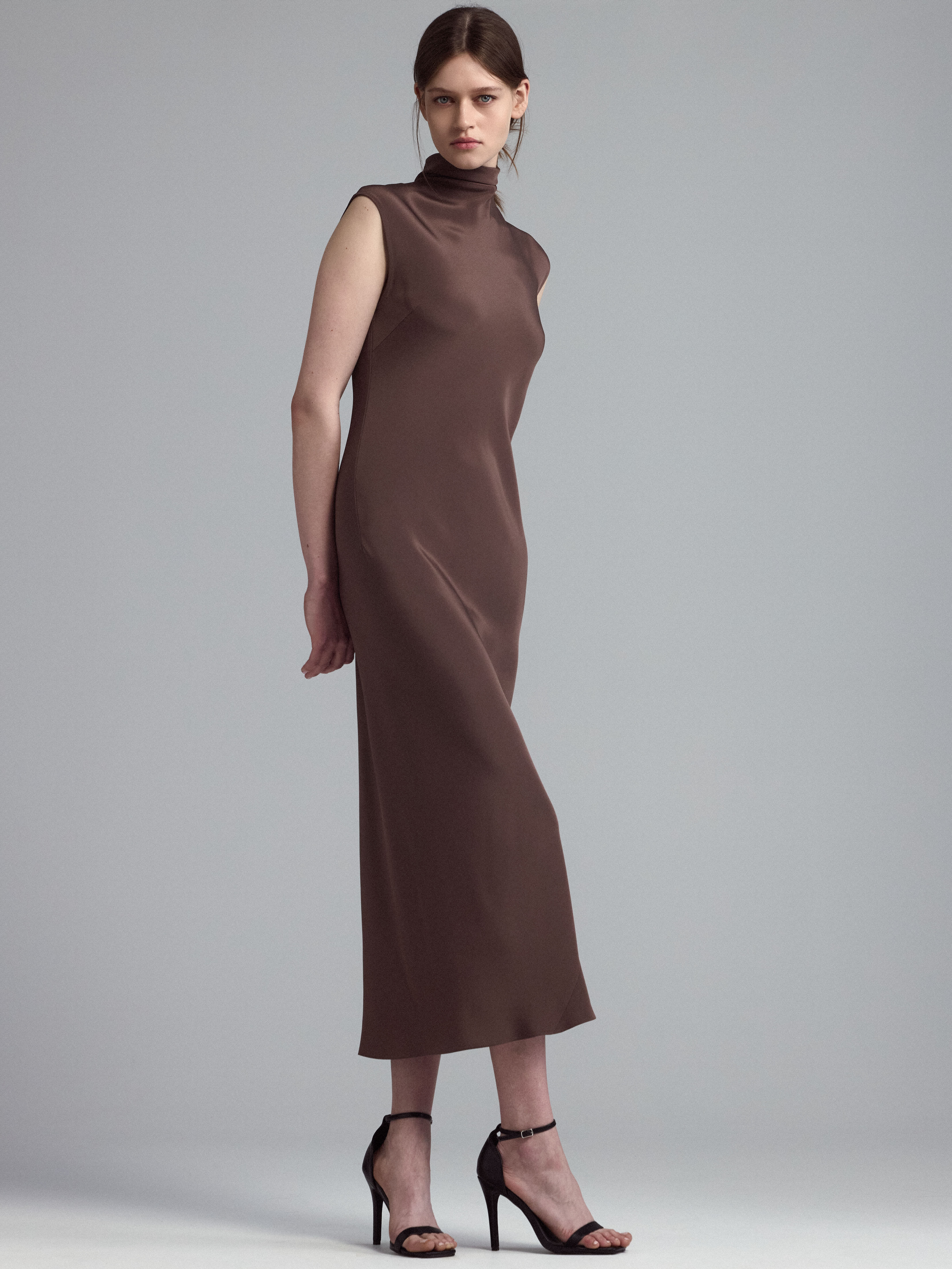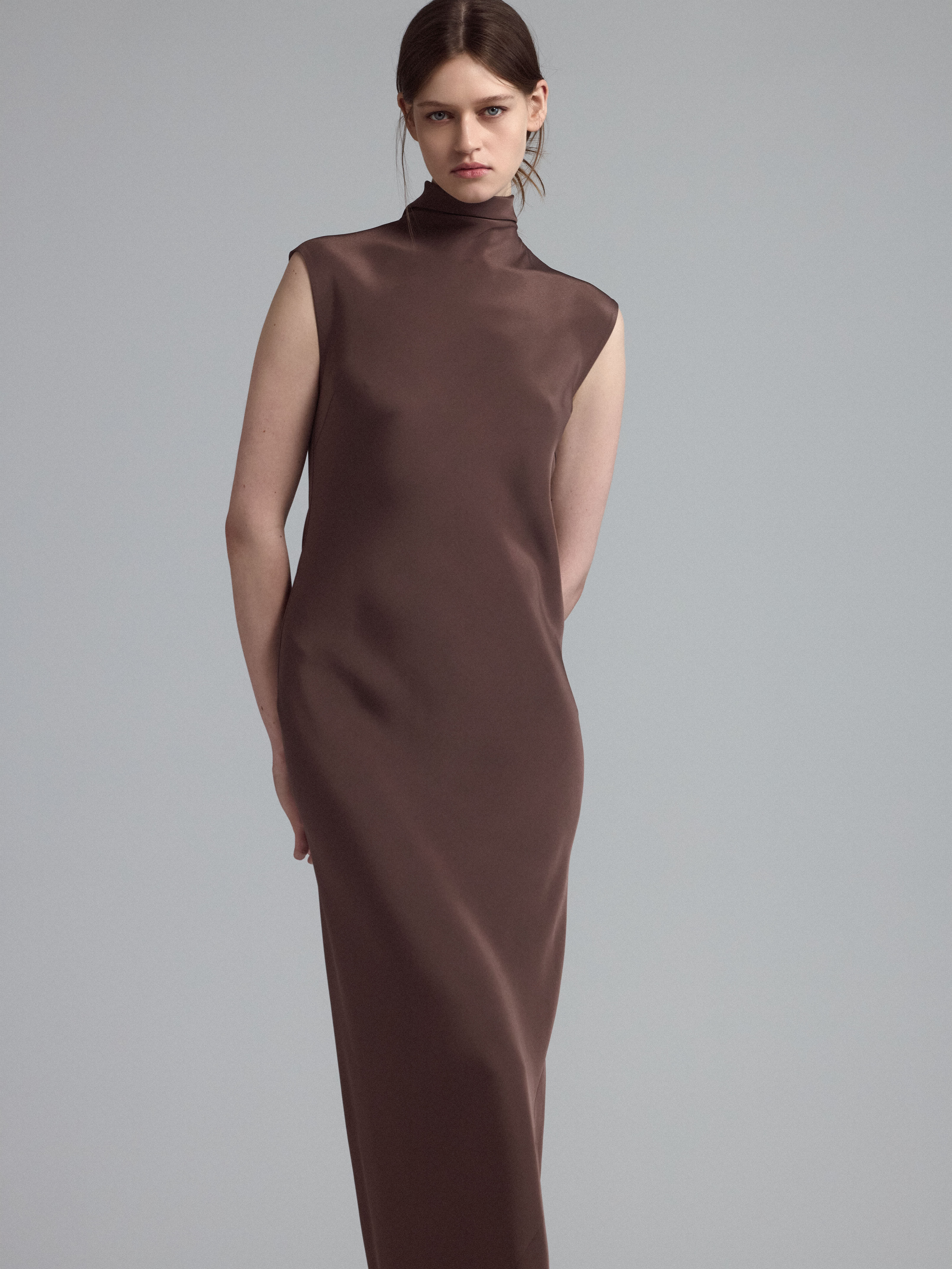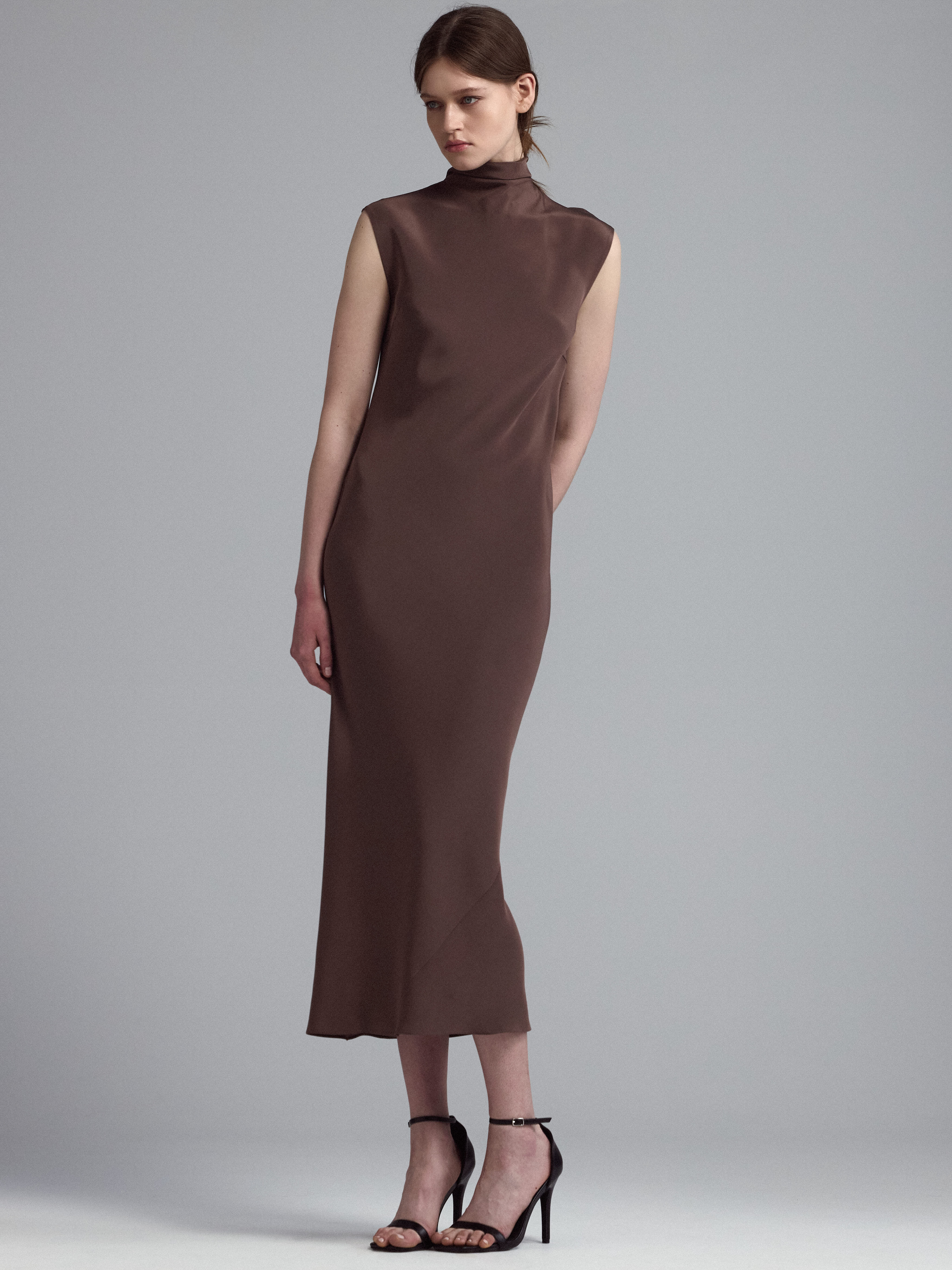 Платье из шелка без рукавов с высоким воротом. Прилегающий силуэт, длина макси и застежка на потайную молнию сзади.