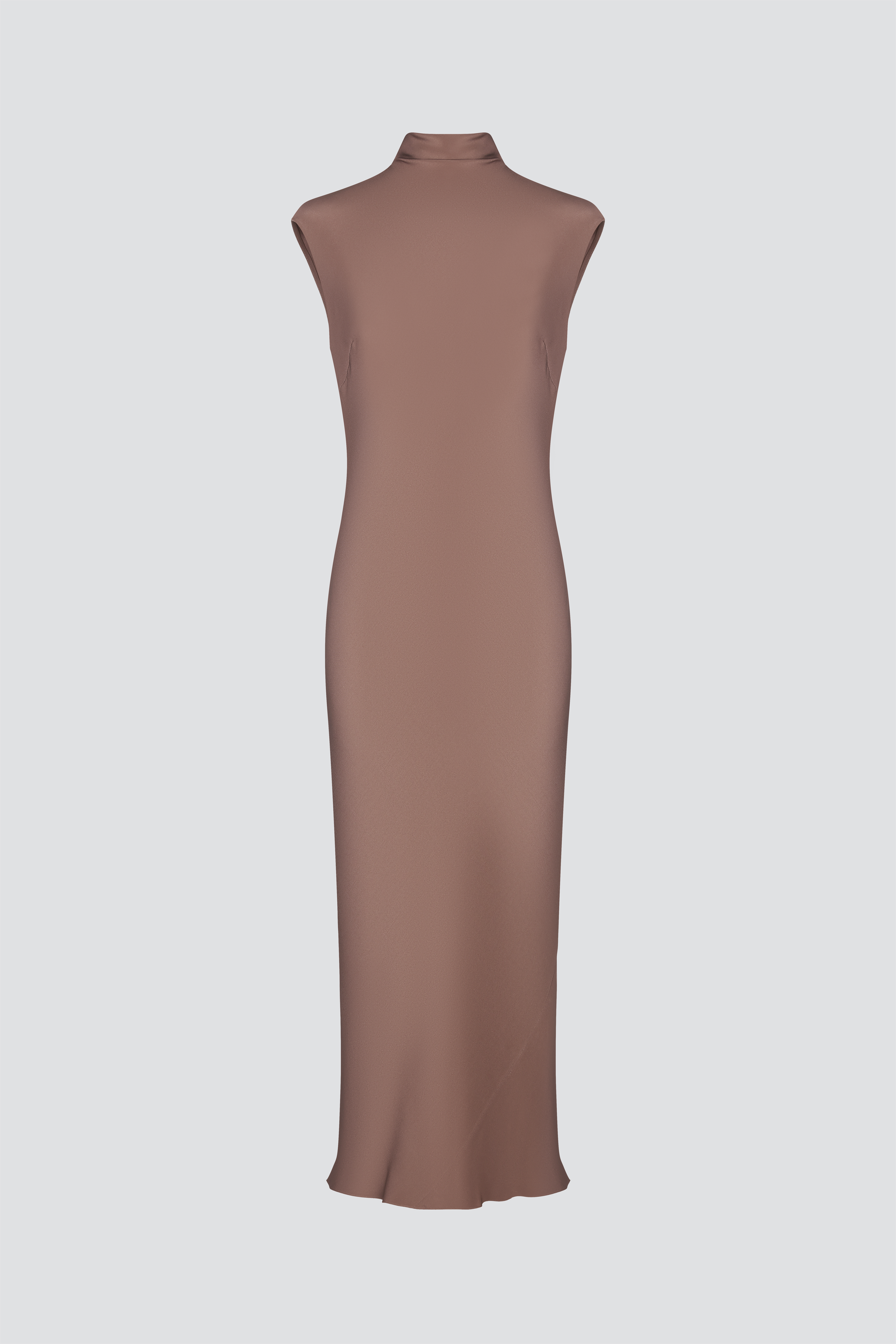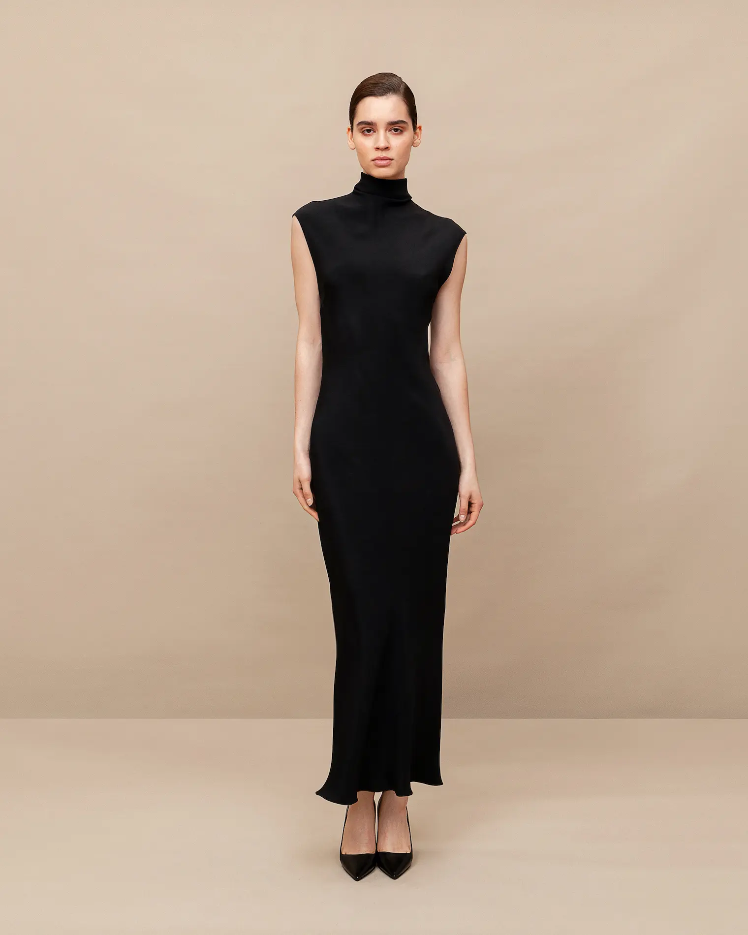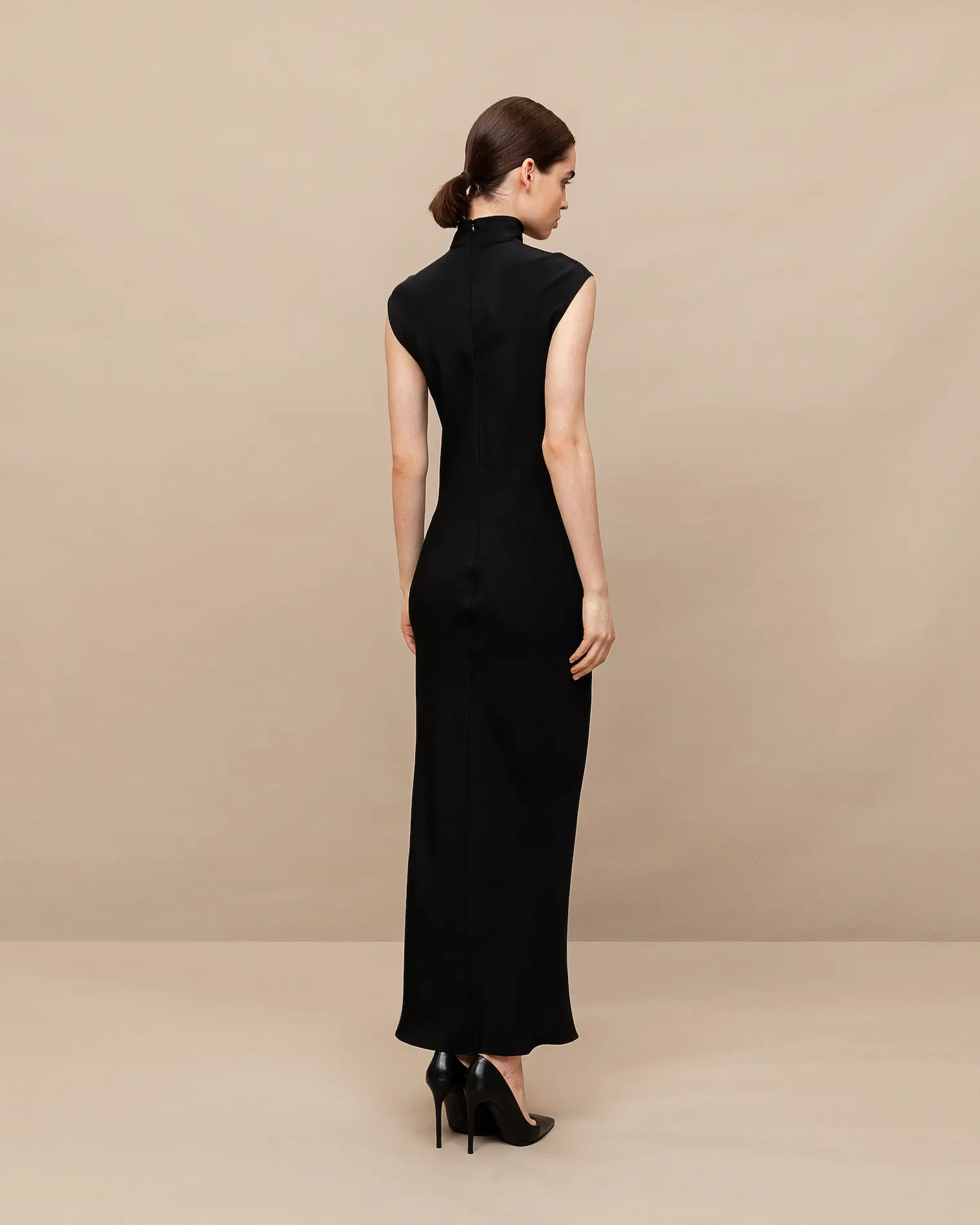 Платье из шелка без рукавов с высоким воротом. Прилегающий силуэт, длина макси и застежка на потайную молнию сзади.