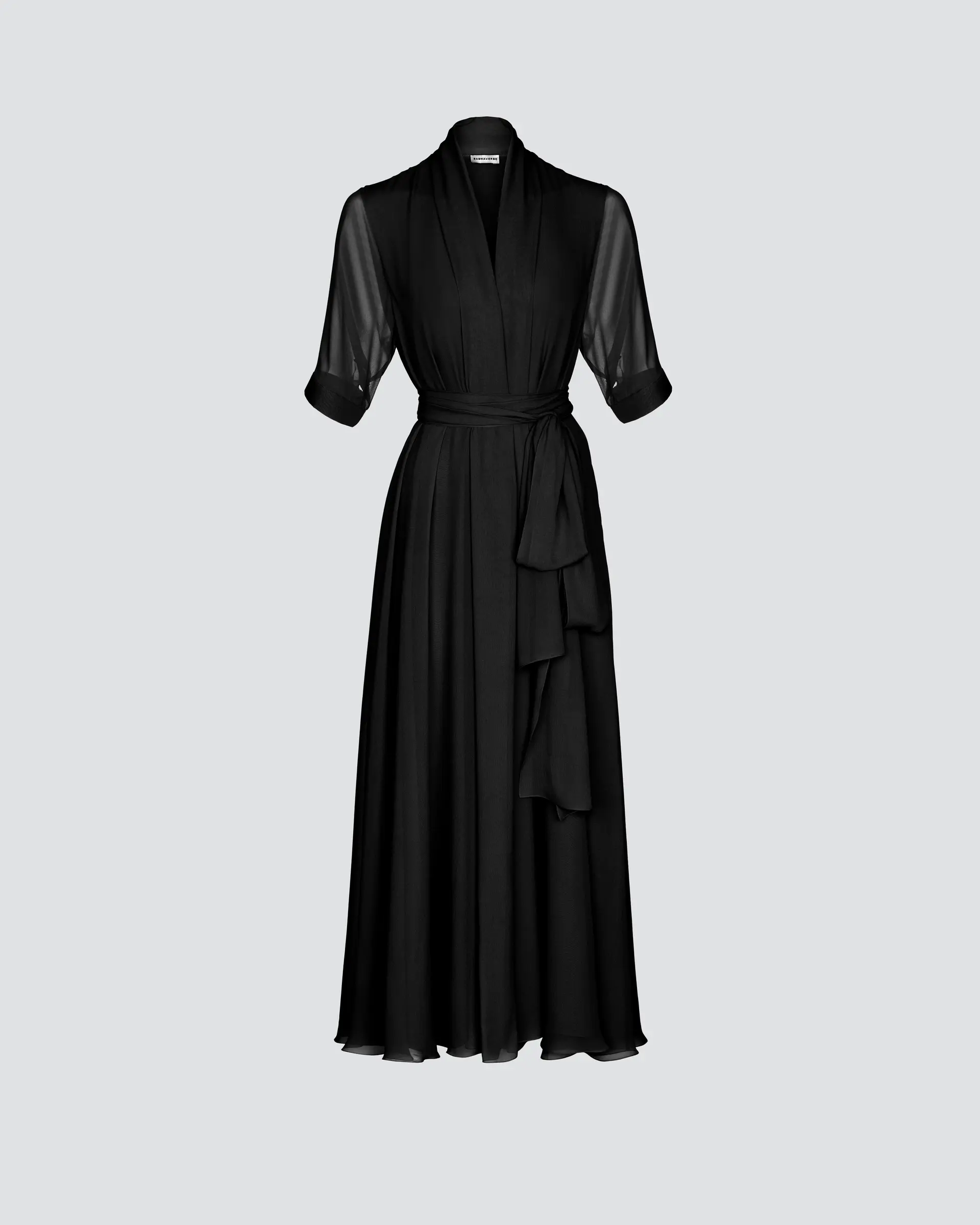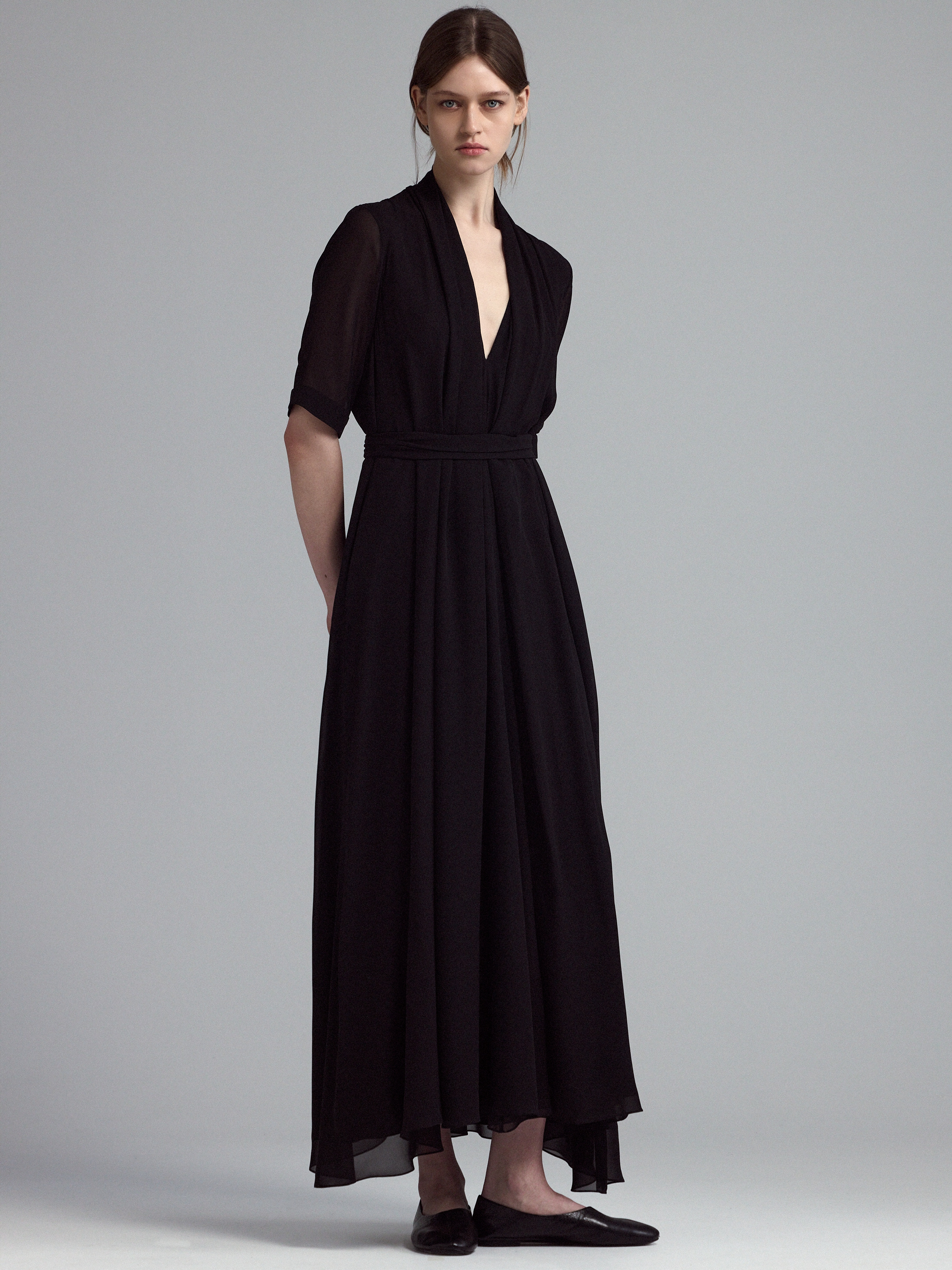 Платье из струящегося шелка. Полупрозрачные рукава, V-образный вырез, длина макси. Свободный силуэт с длинным поясом, если хочется сделать акцент на талии.