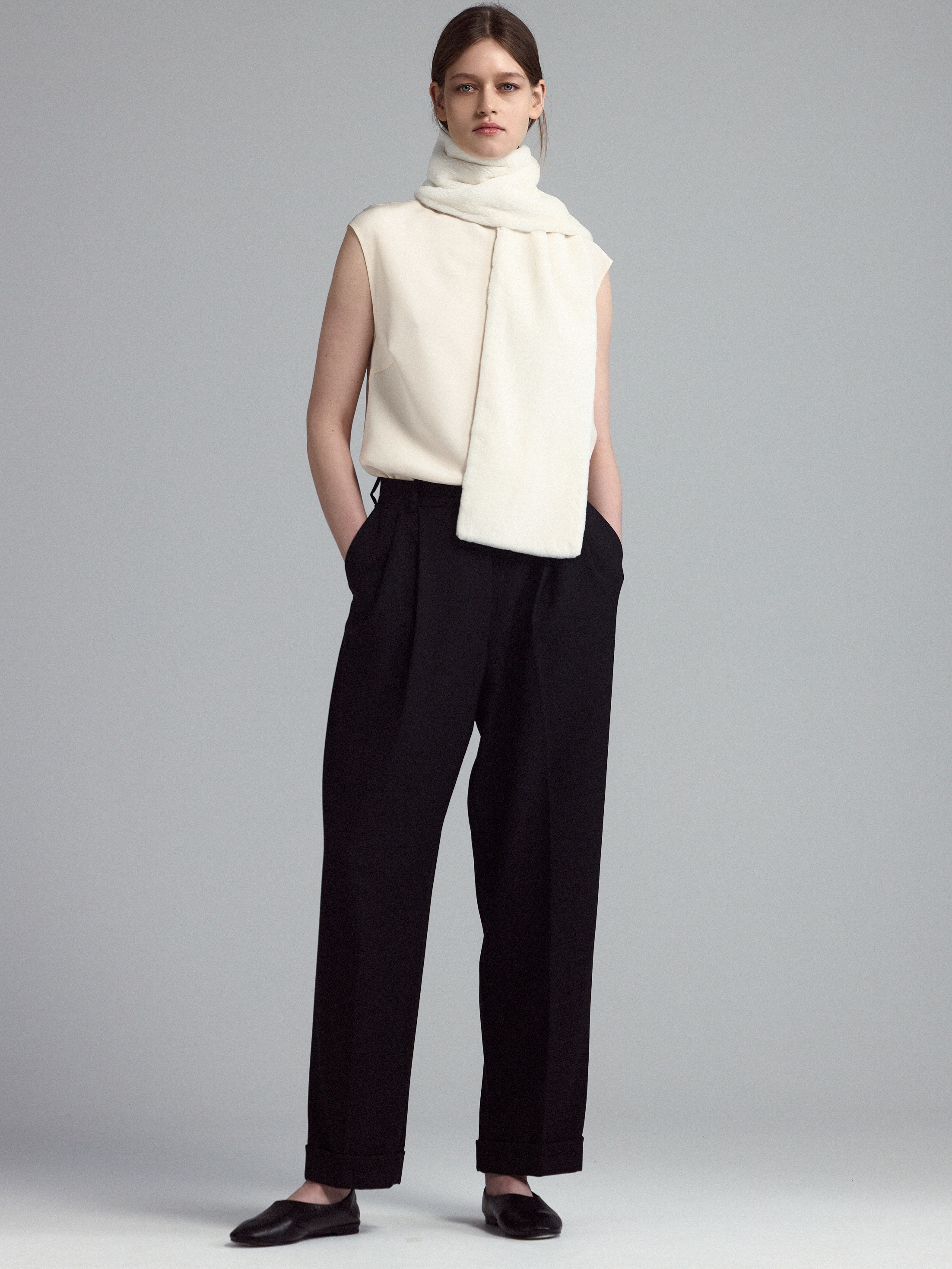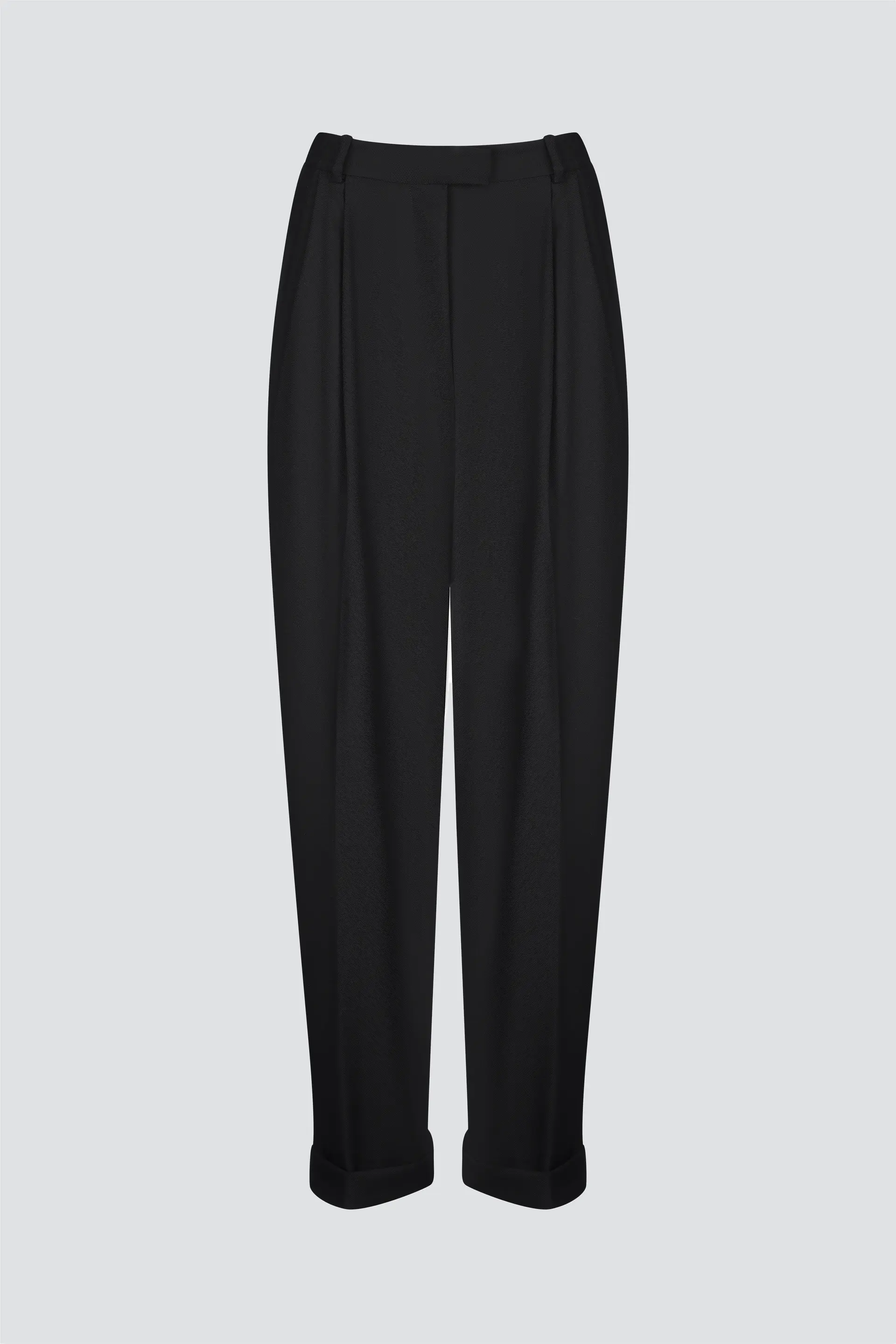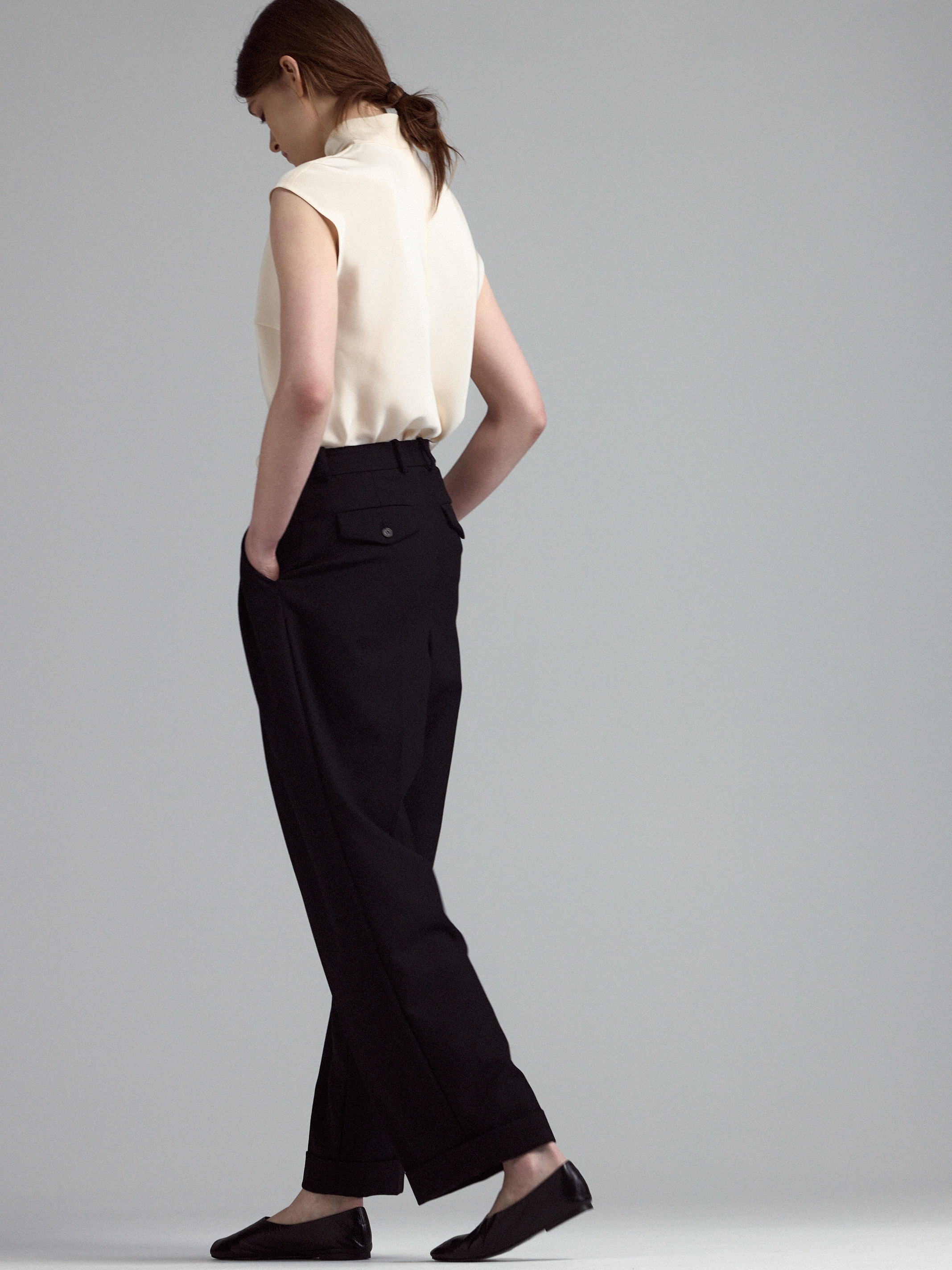 Брюки из шерсти свободного силуэта с отворотами по низу, с мягкими складками по талии и с прорезными карманами с клапаном по спинке.