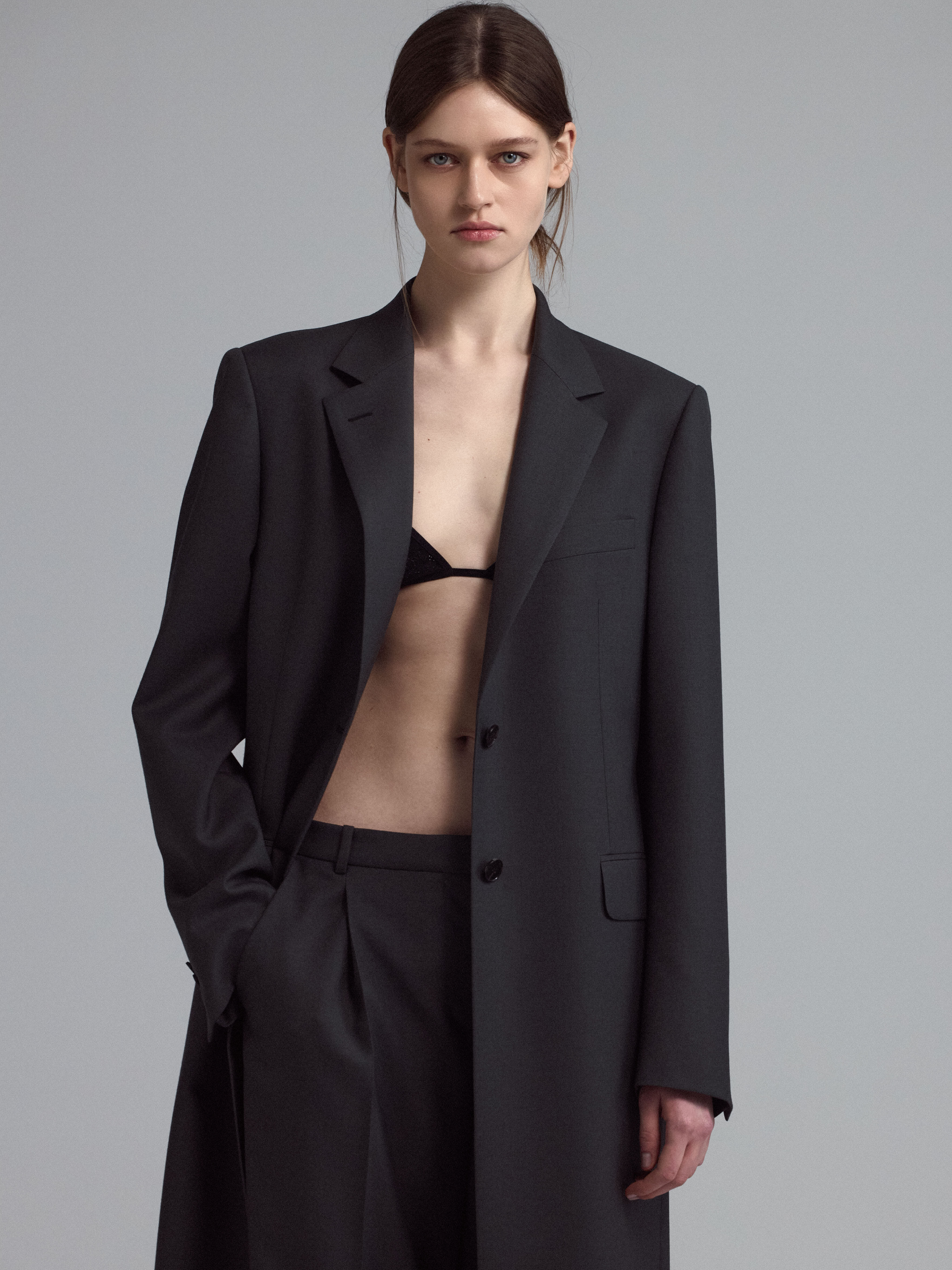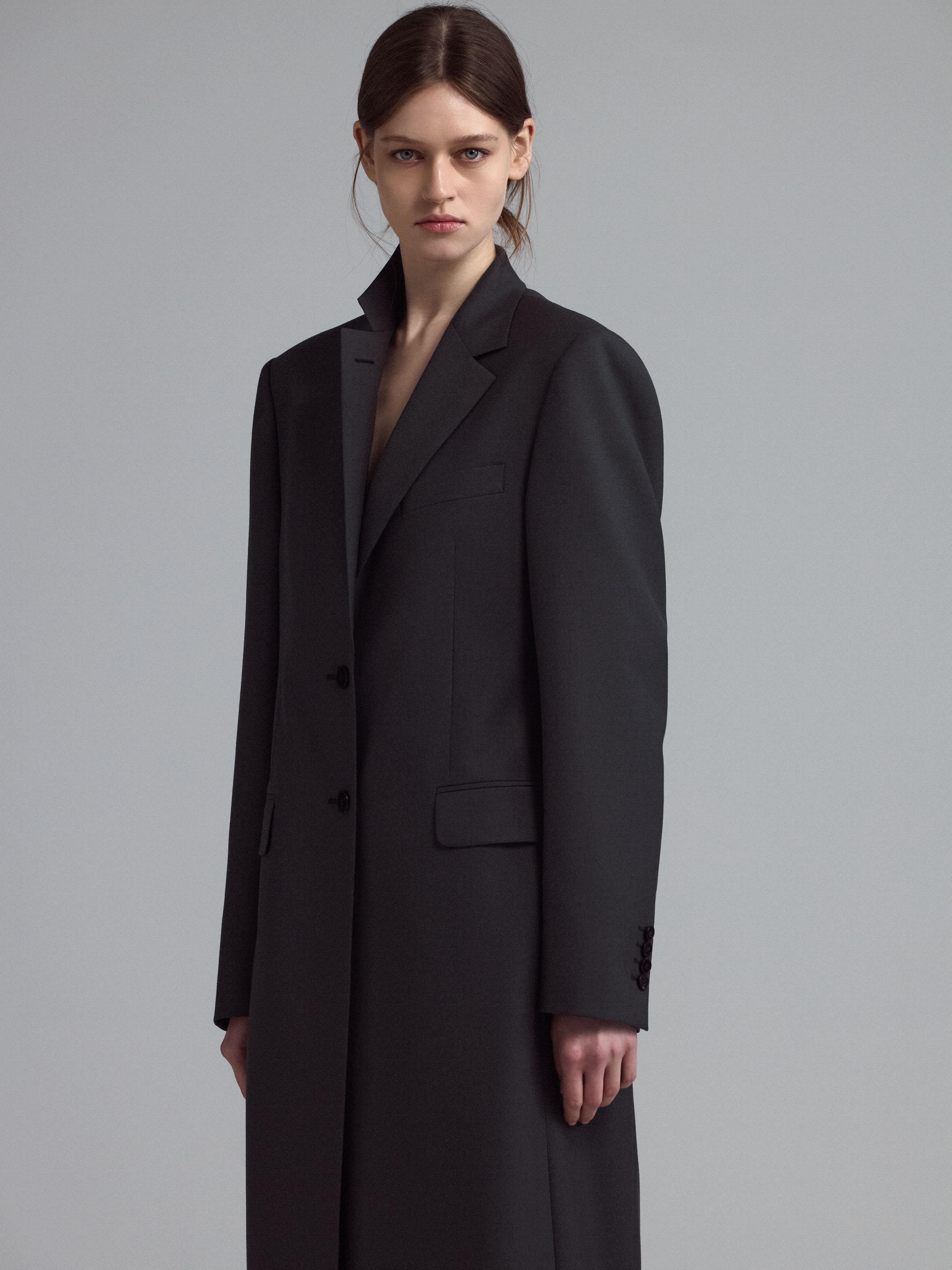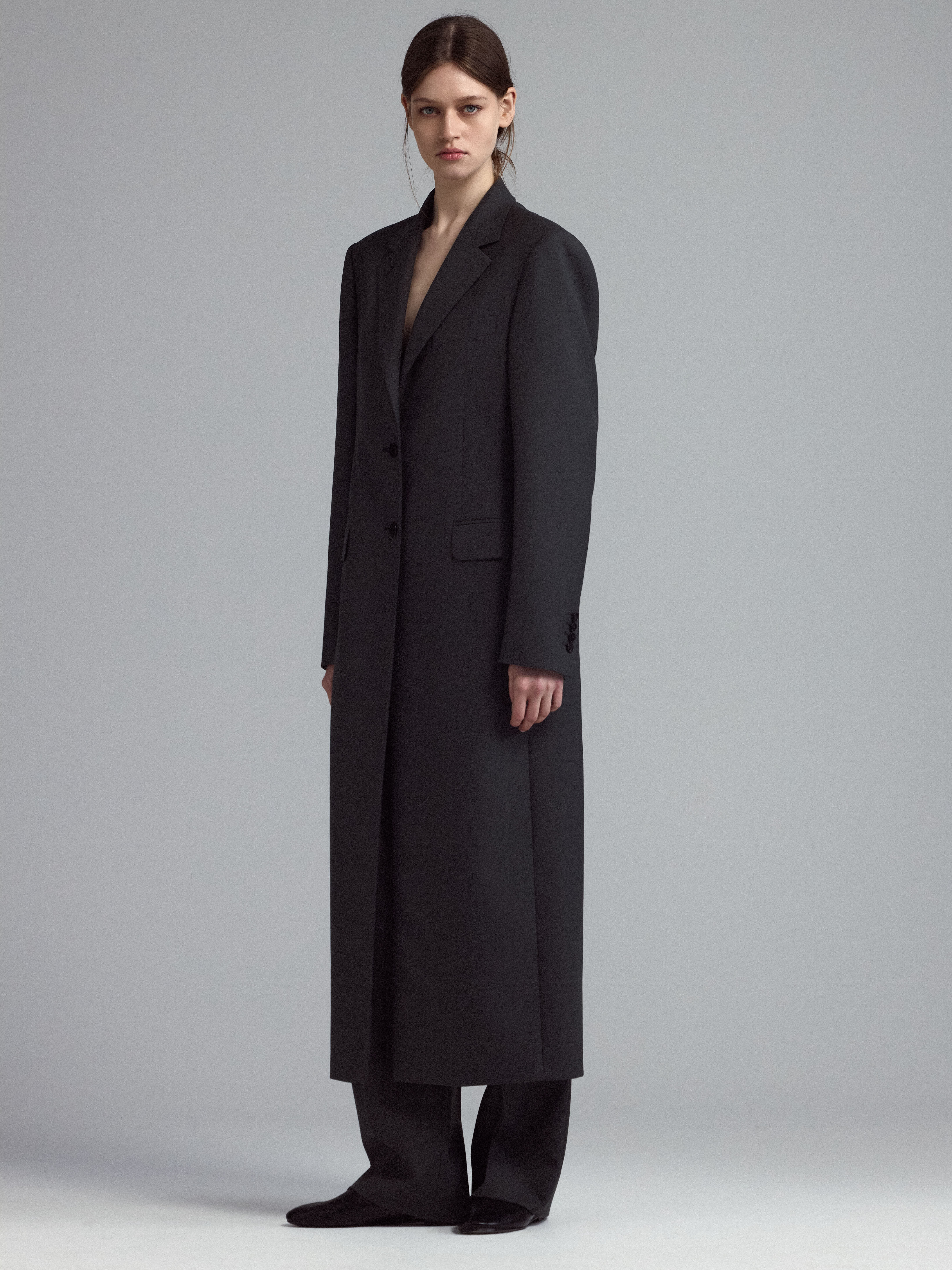 Классическое однобортное пальто из тонкой смесовой шерсти, с английским воротником и с застежкой на две пуговицы.