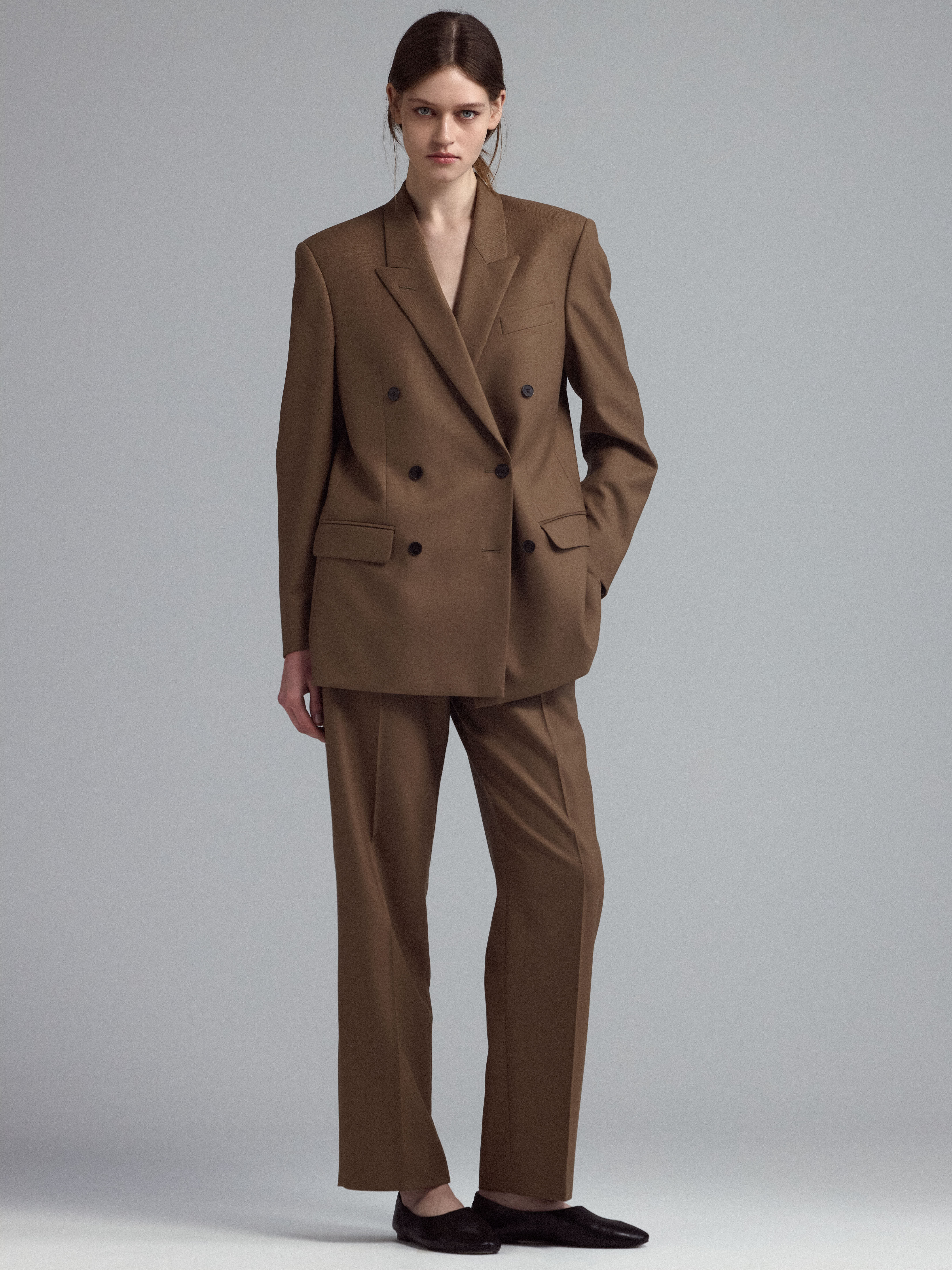 Двубортный пиджак из шерсти. Отложной воротник, длинный рукав и карманы с клапанами.