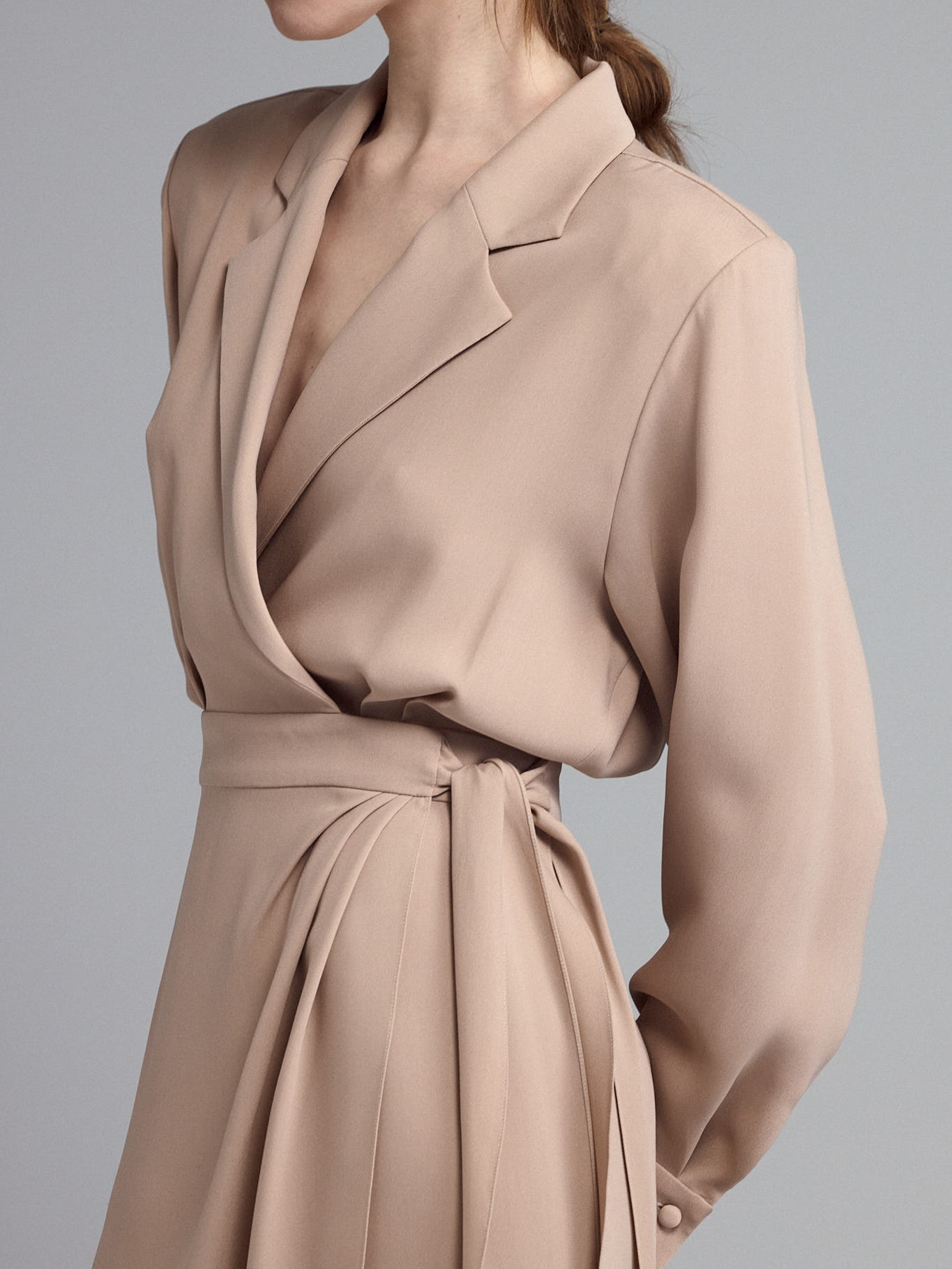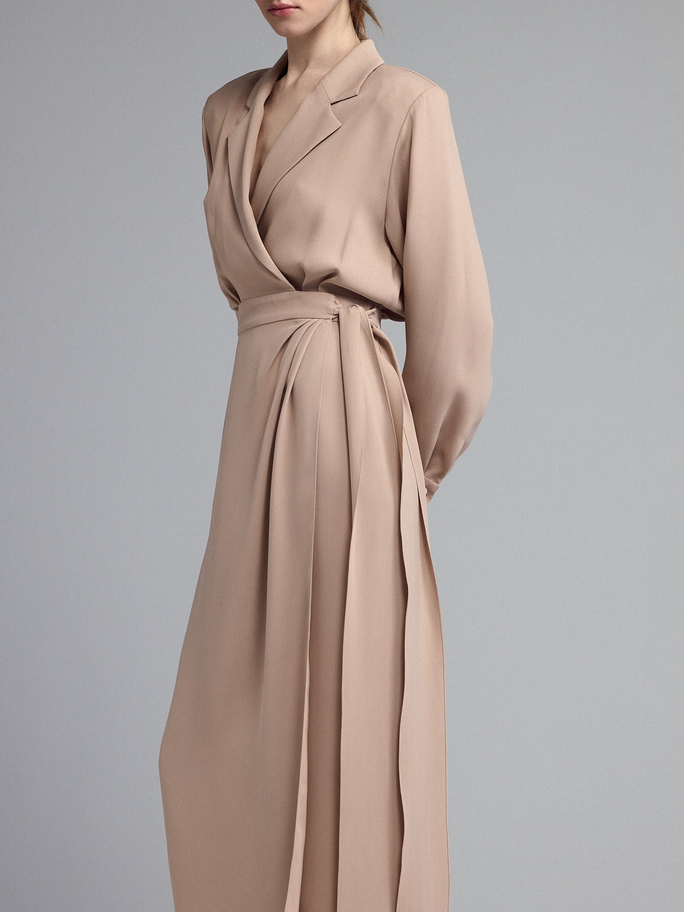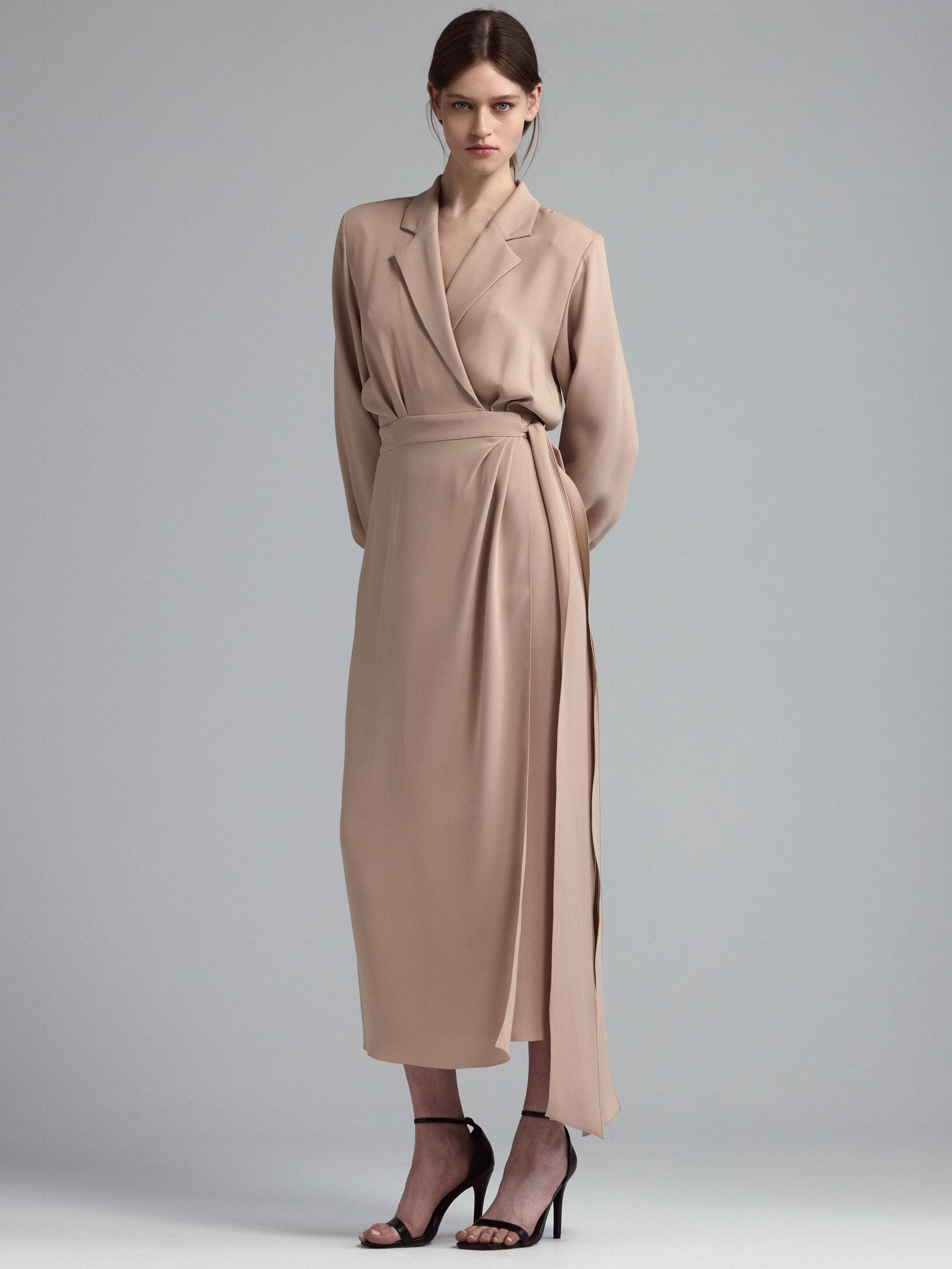 Платье вечернее из шелка с запахом, с фиксацией по талии на пояс-бант. Отрезной лиф с английским воротником. Юбка с мягкими складками.