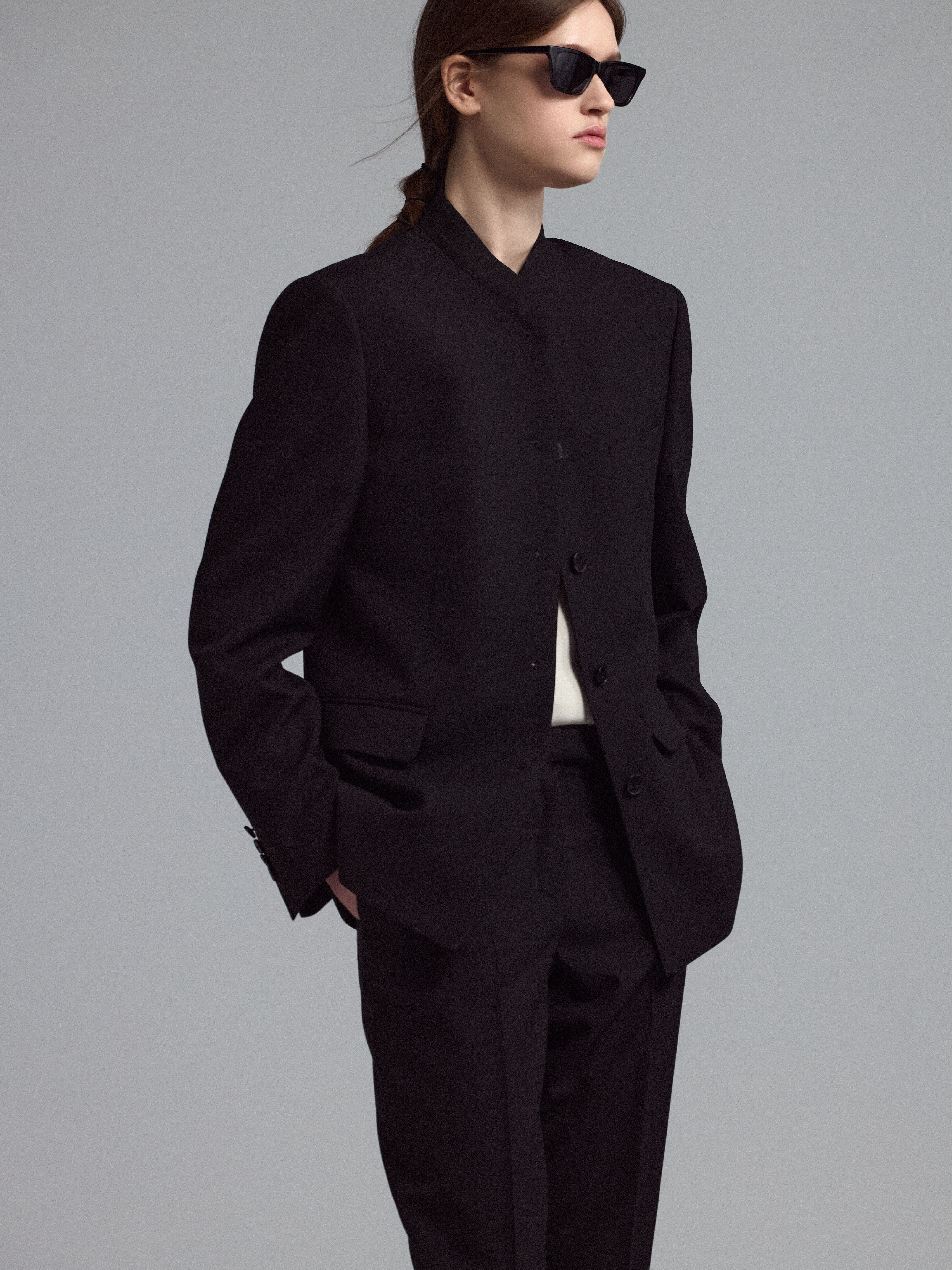Шерстяной однобортный пиджак с воротником стойка. Прорезные карманы с клапаном, застежка на петли и пуговицы.