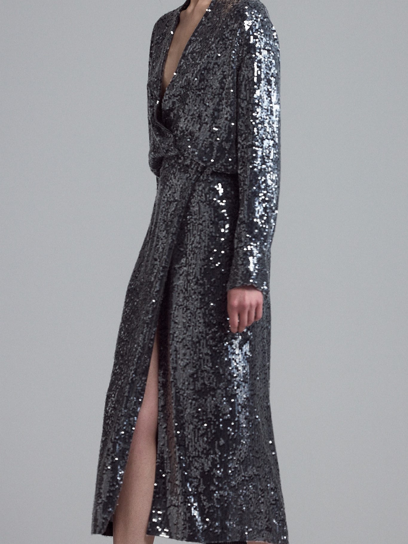 Вечернее платье с отделкой из пайеток. Отрезное по талии, лиф и юбка с запахом.