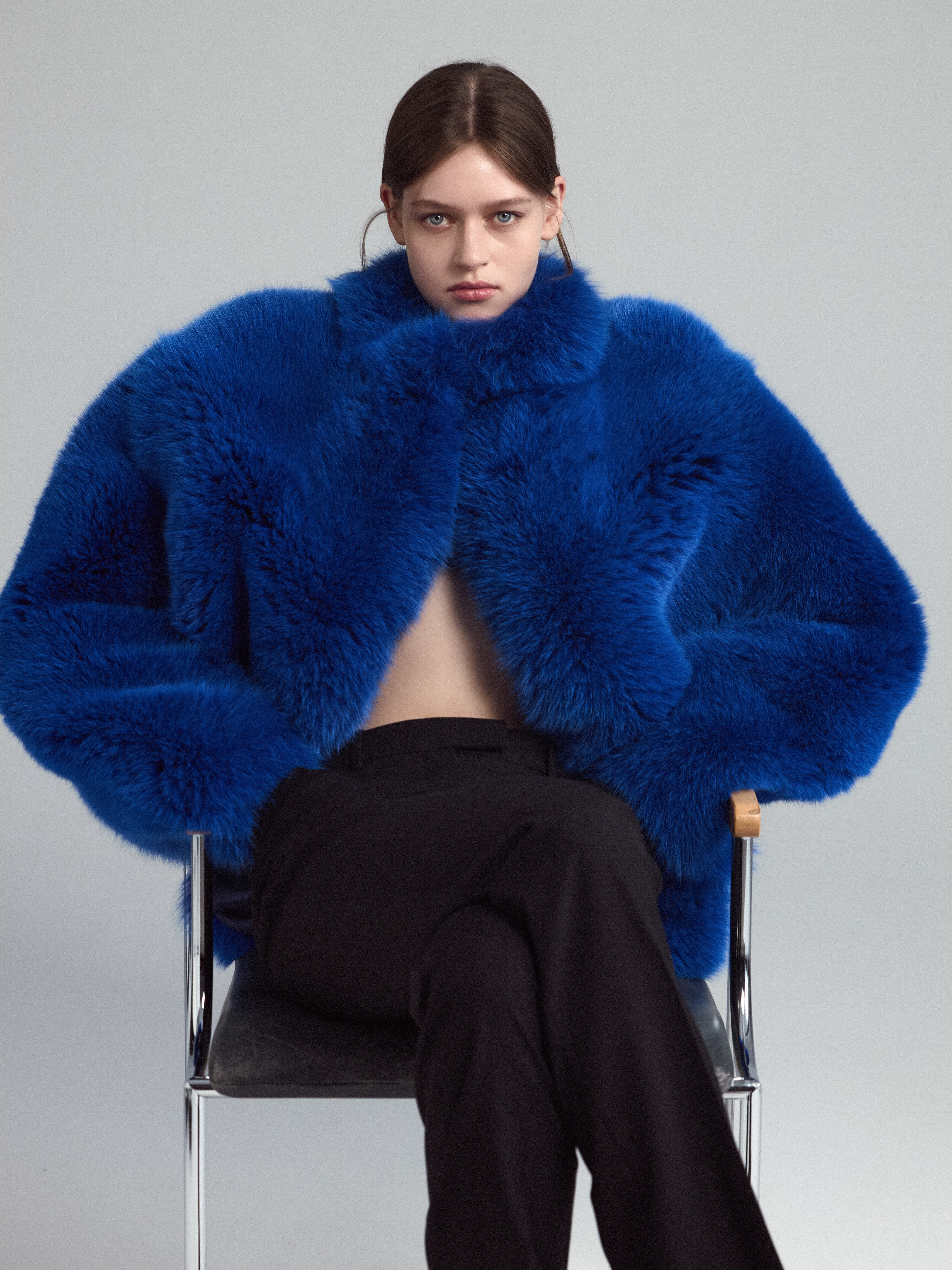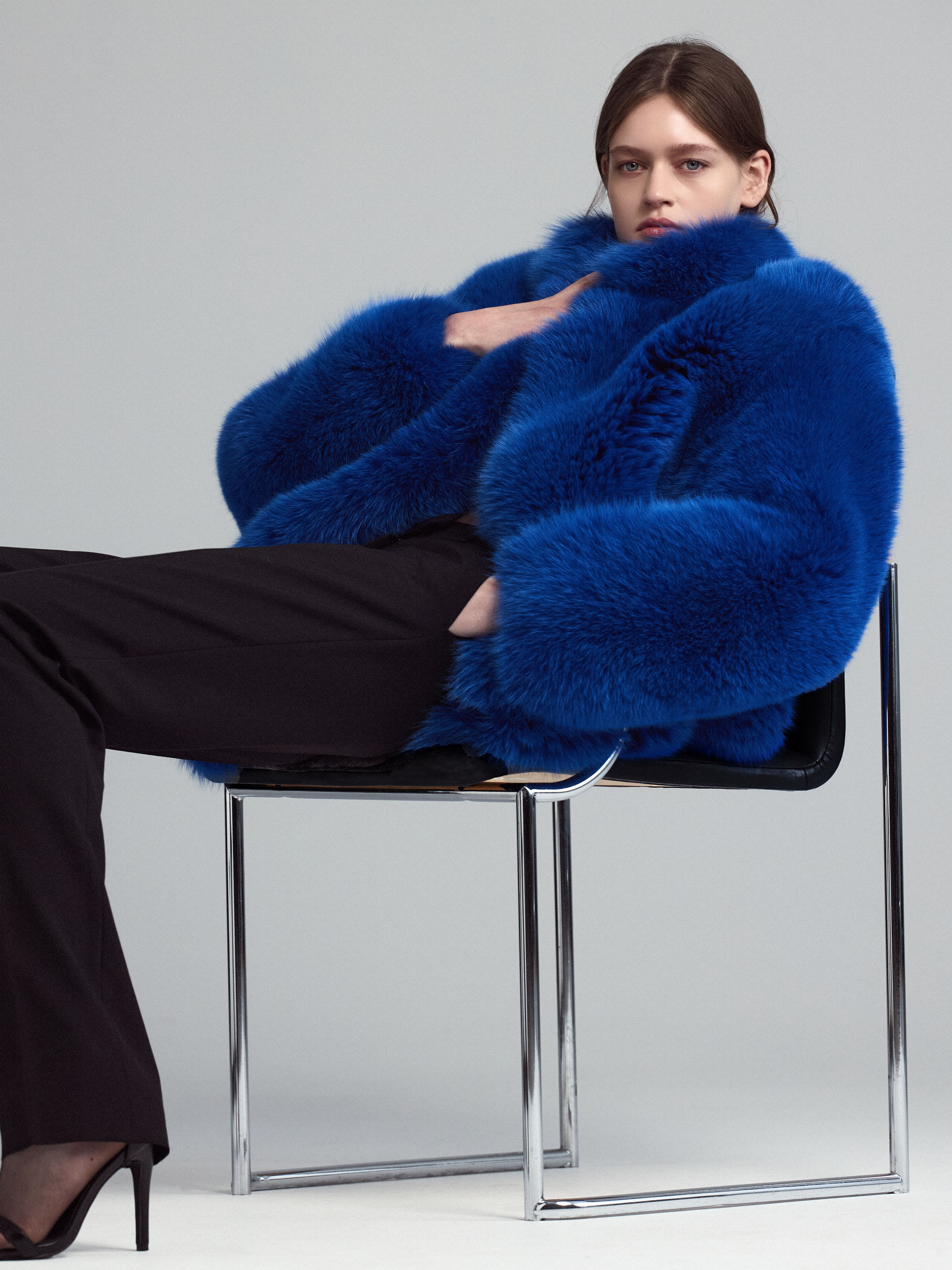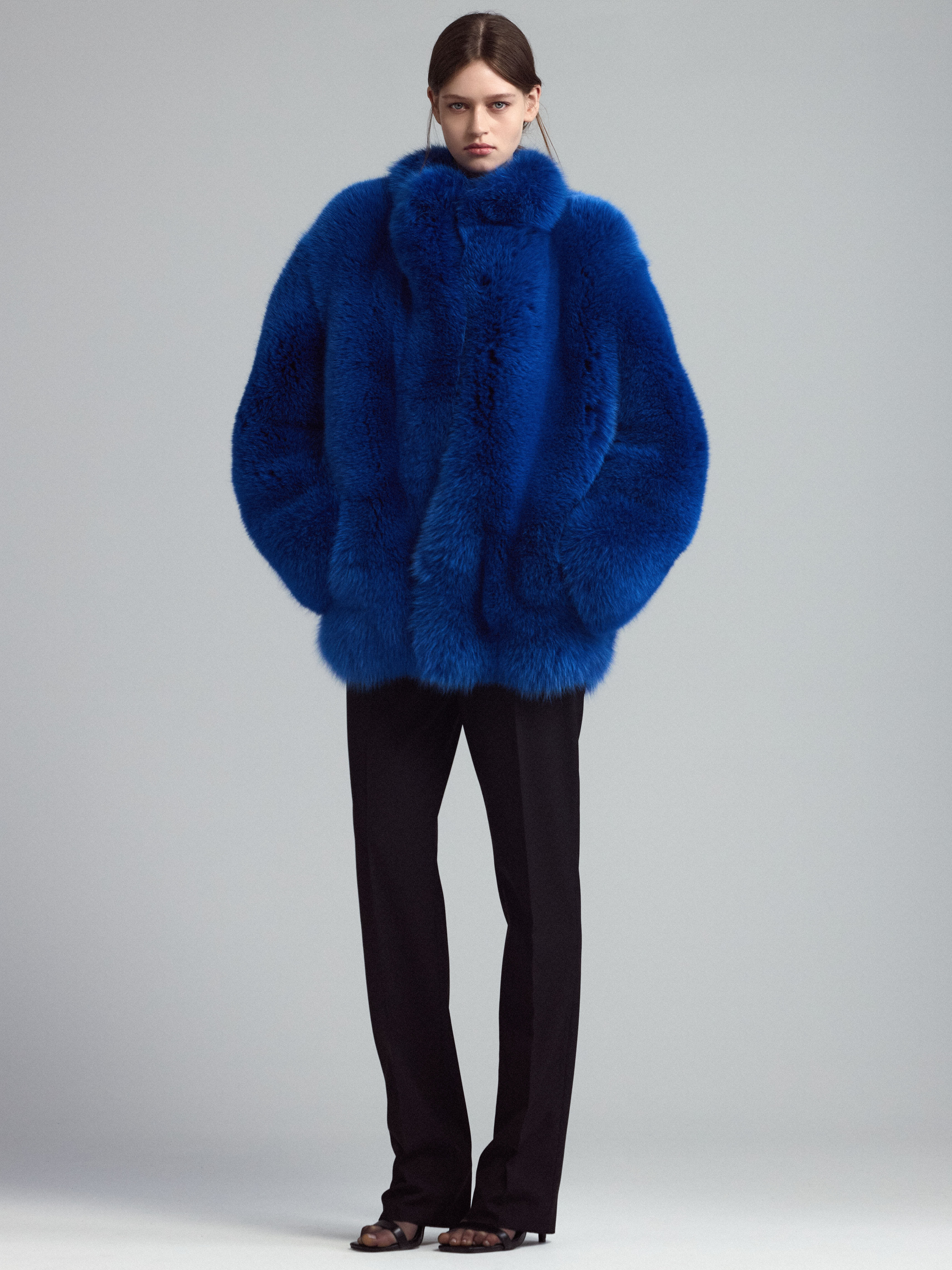 Шуба из меха арктической лисы. Подкладка в тон, прямой силуэт с воротником-стойкой.