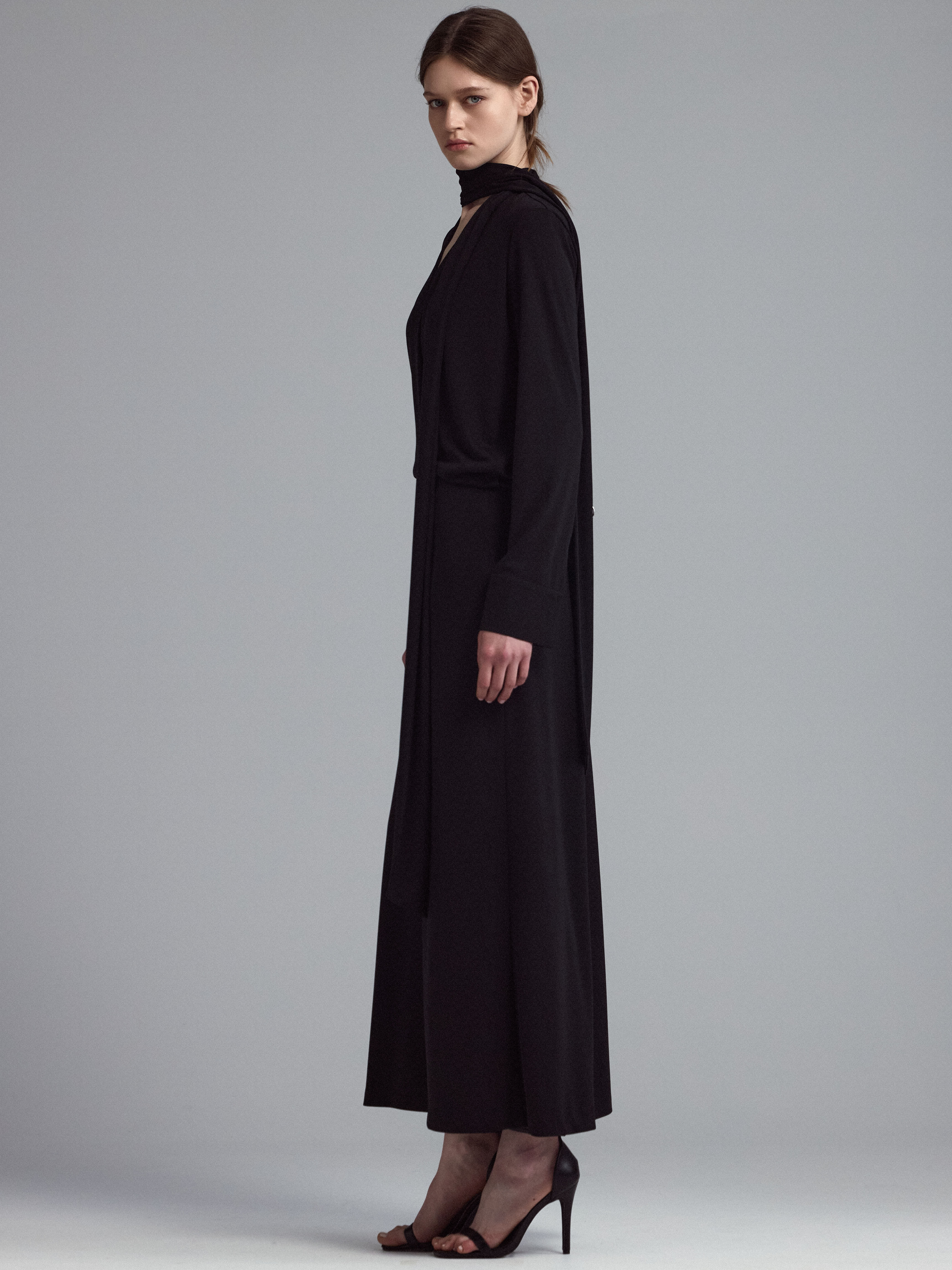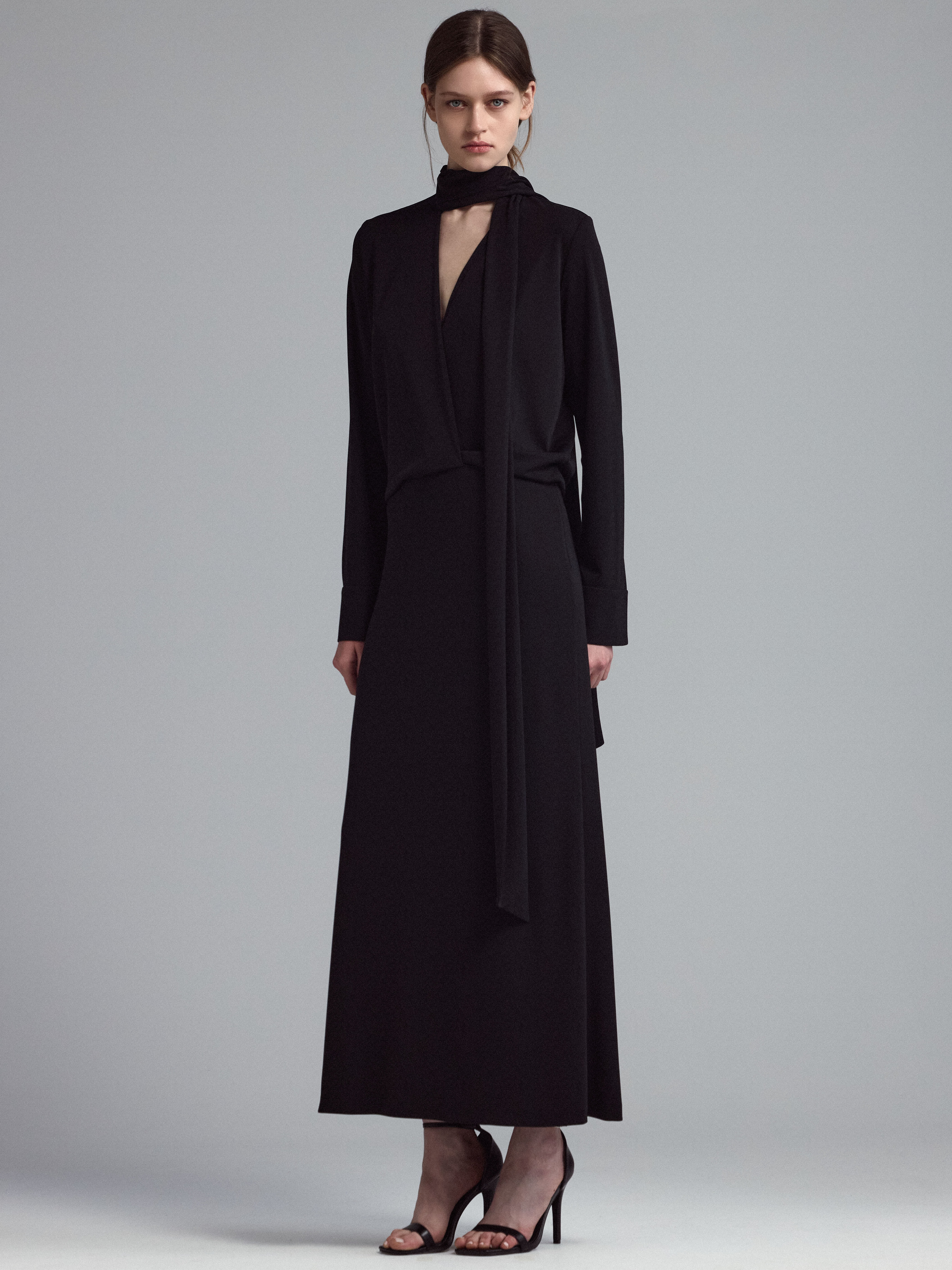 Трикотажное платье с шарфом. Акцент кроя на талии, V-образный вырез и длинные рукава.
