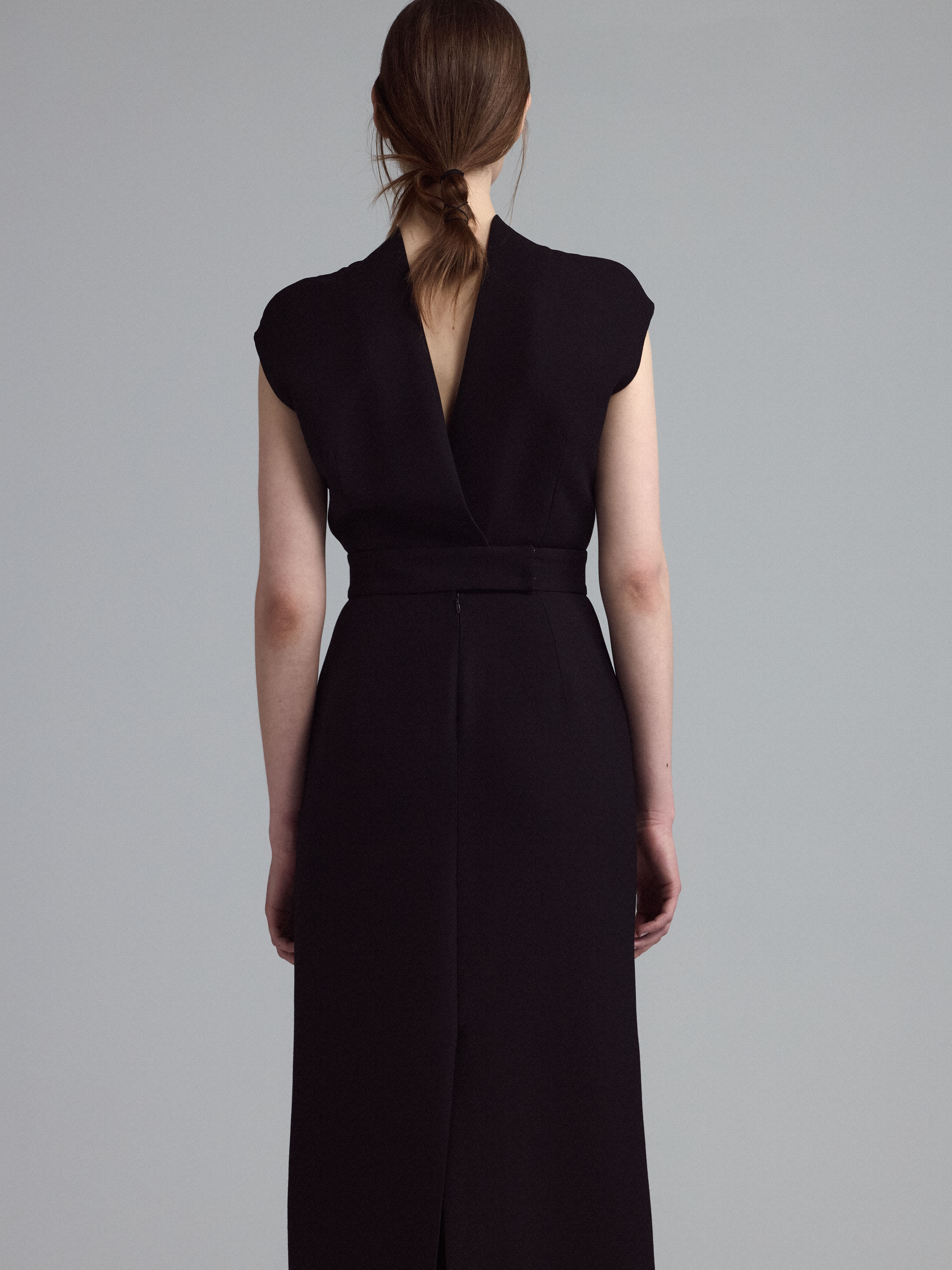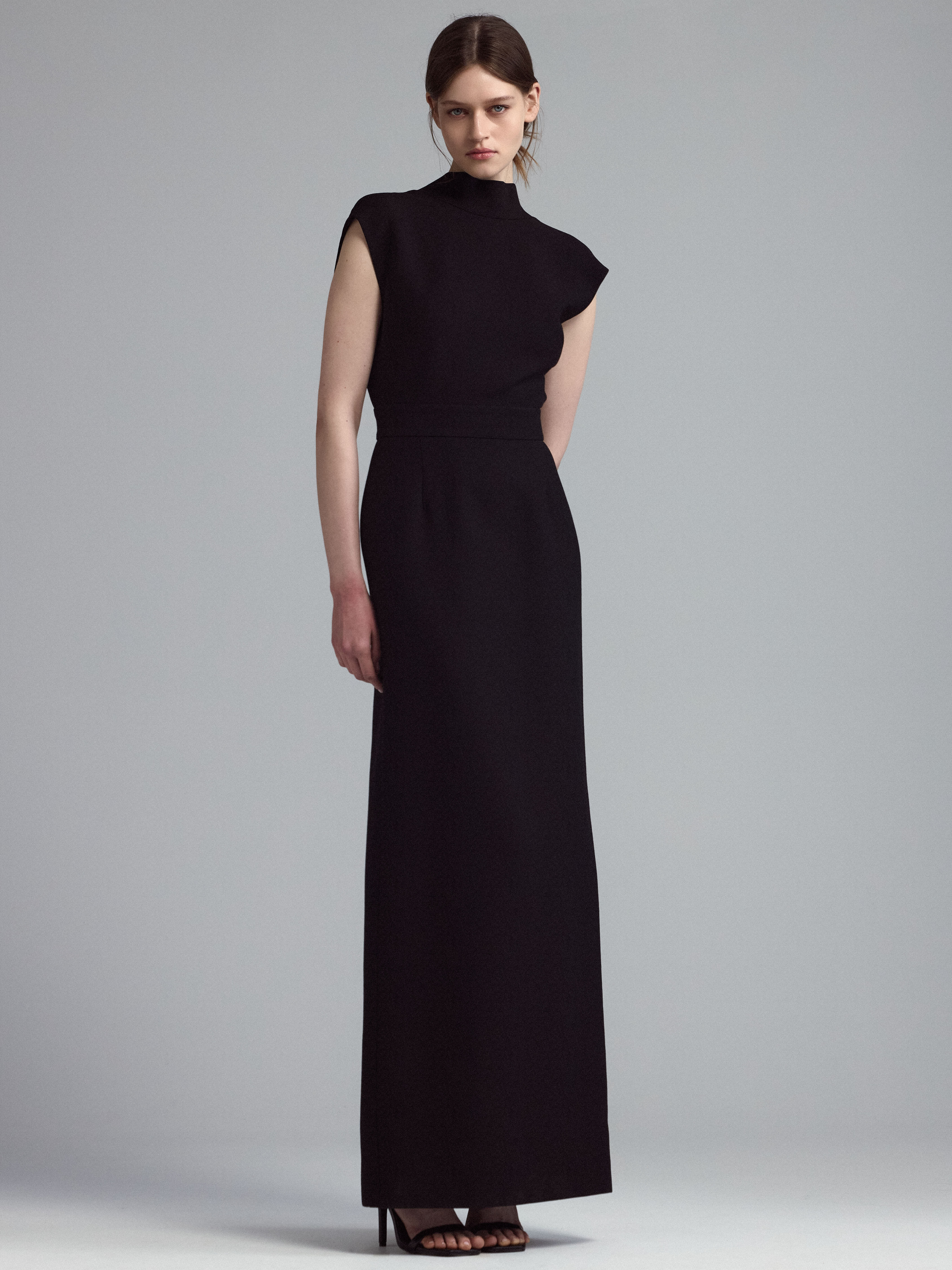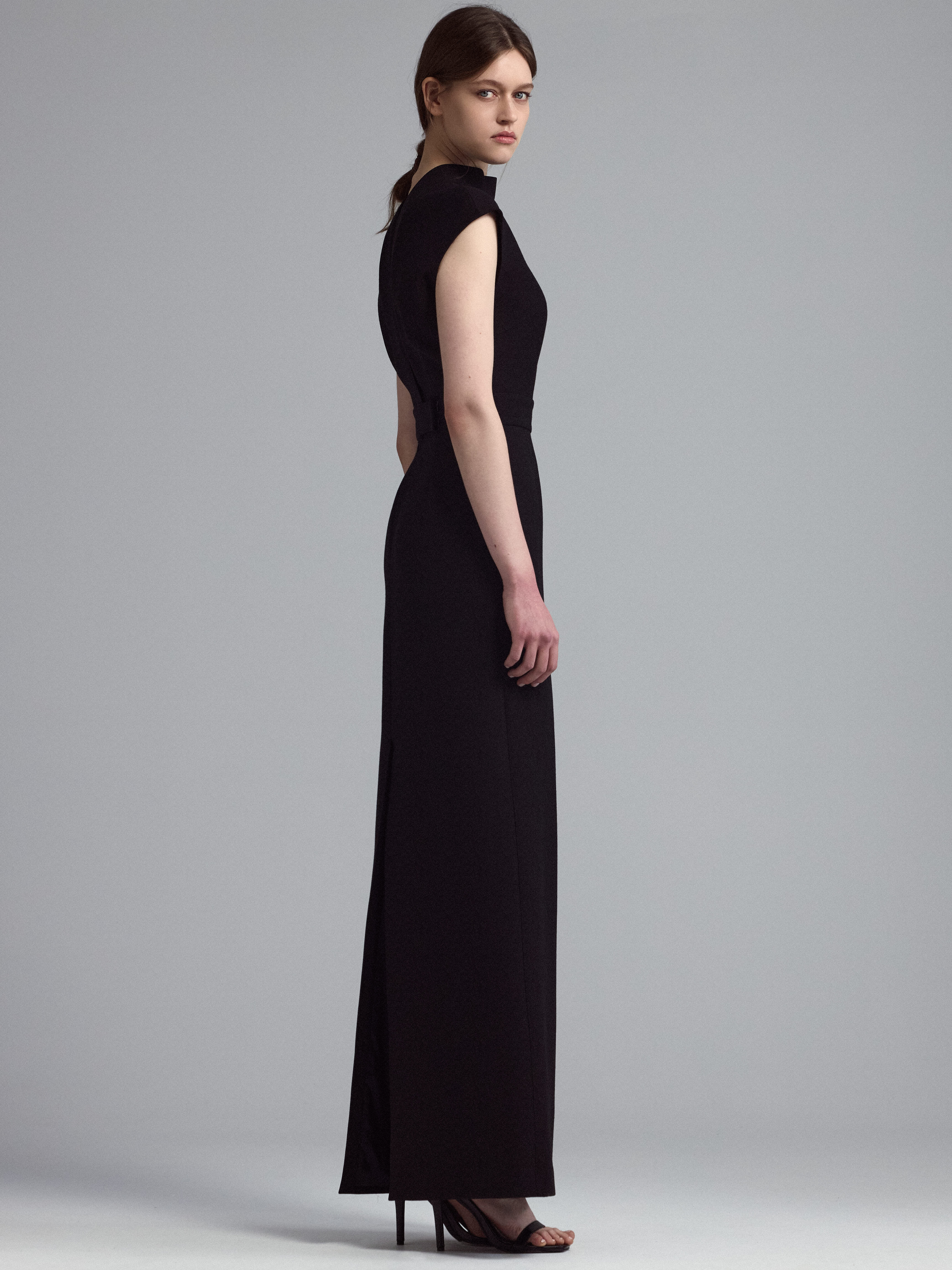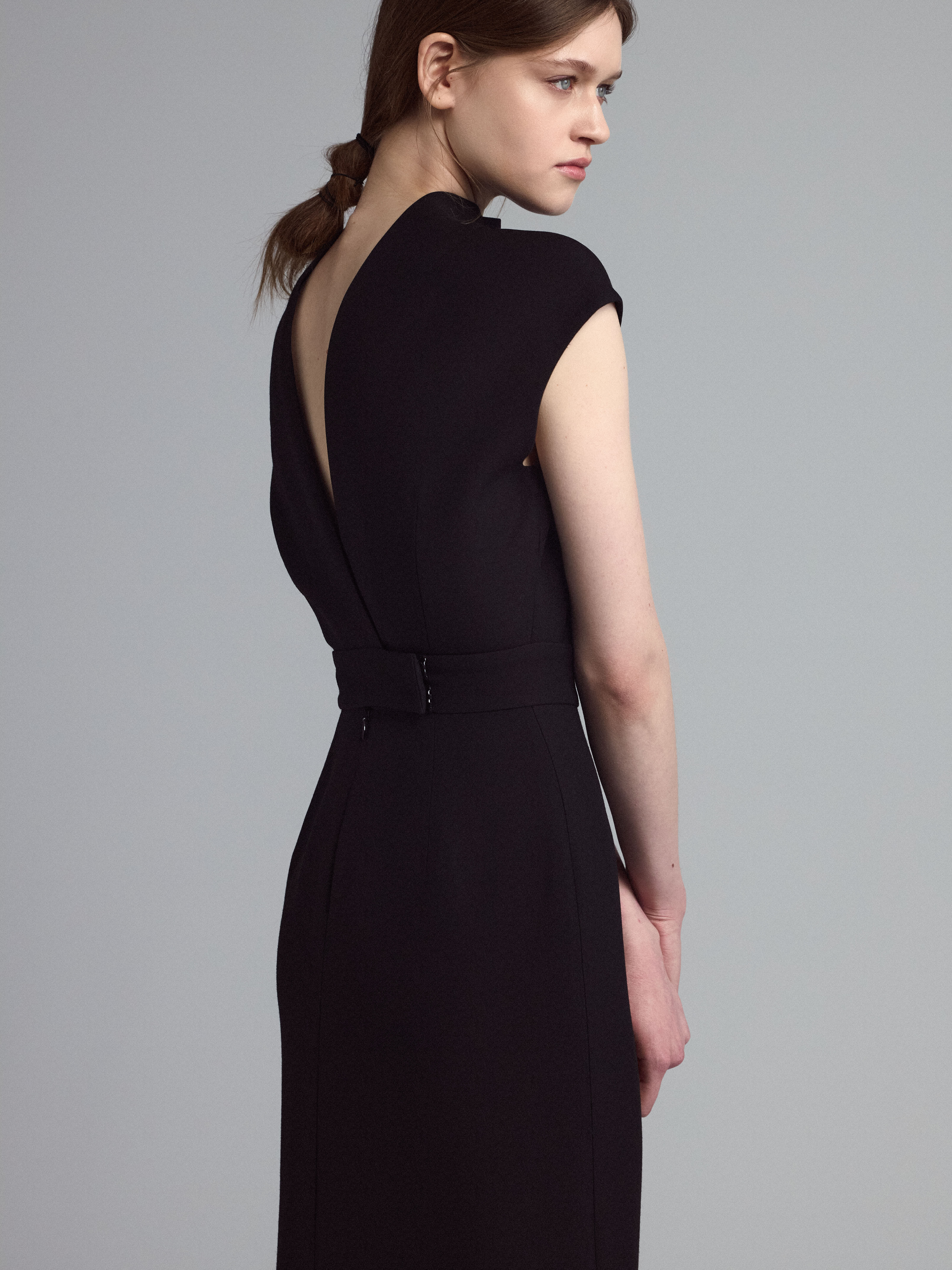 Вечернее платье длиной в пол, с отрезной талией, без рукавов, с V-образном глубоким вырезом по спинке.